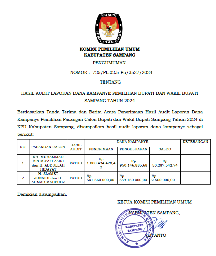 #TemanPemilih, KPU Kabupaten Sampang telah menetapkan Pasangan Calon Bupati dan dan Wakil Bupati Terpilih Kabupaten Sampang pada tanggal 06 Februari 2025 setelah Putusan Mahkamah Konstitusi Republik Indonesia Nomor 237/PHPU.BUP-XXIII/2025 dalam perkara Perselisihan Hasil Pemilihan Umum Bupati dan Wakil Bupati Sampang Tahun 2024 yang selesai diucapkan pada tanggal 05 Februari 2025 pukul 21.19 WIB dalam Sidang Pleno Mahkamah Konstitusi terbuka untuk umum.