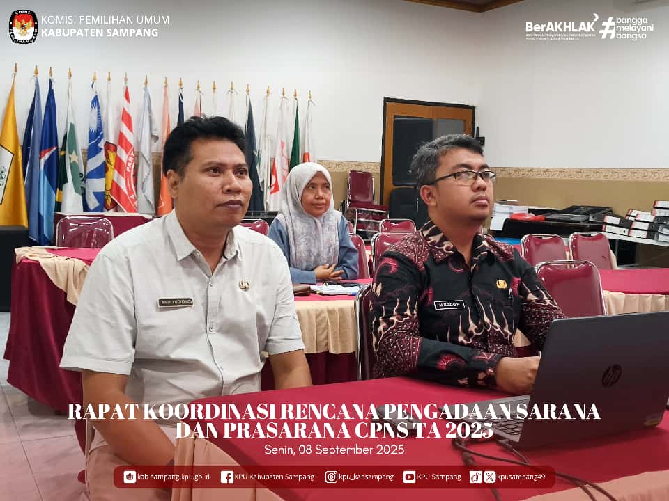 #TemanPemilih.... Hari ini Senin, 08 September 2025, KPU Kabupaten Sampang mengikuti Rapat Koordinasi Rencana Pengadaan Sarana Prasarana bagi CPNS TA 2025 di KPU Provinsi dan KPU Kab/Kota Se-Jatim melalui zoom meeting di Aula KPU Kabupaten Sampang.