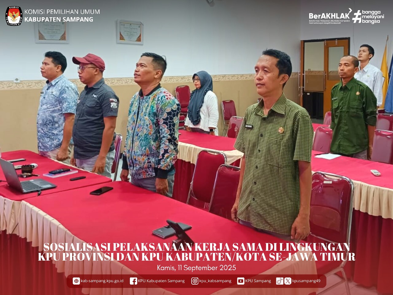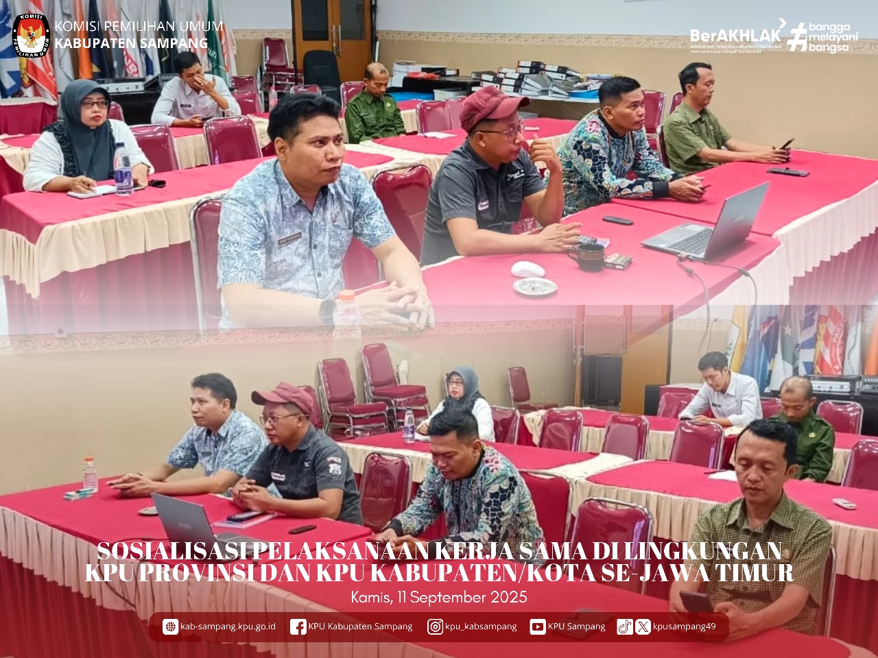 #TemanPemilih.... Hari ini Kamis, 11 September 2025, KPU Kabupaten Sampang mengikuti Sosialisasi Pelaksanaan Kerja Sama di Lingkungan KPU Provinsi dan KPU Kabupaten/Kota Se-Jawa Timur secara daring melalui Zoom Meeting di Aula KPU Kabupaten Sampang.