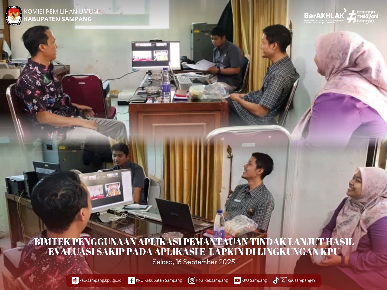 #TemanPemilih.... Hari ini, Selasa, 16 September 2025, KPU Kabupaten Sampang mengikuti Bimbingan Teknis Penggunaan Aplikasi Pemantauan Tindak Lanjut Hasil Evaluasi Sistem Akuntabilitas Kinerja Instansi Pemerintah (SAKIP) pada Aplikasi E-Lapkin di Lingkungan KPU secara daring melalui Zoom Meeting di Kantor KPU Kabupaten Sampang.