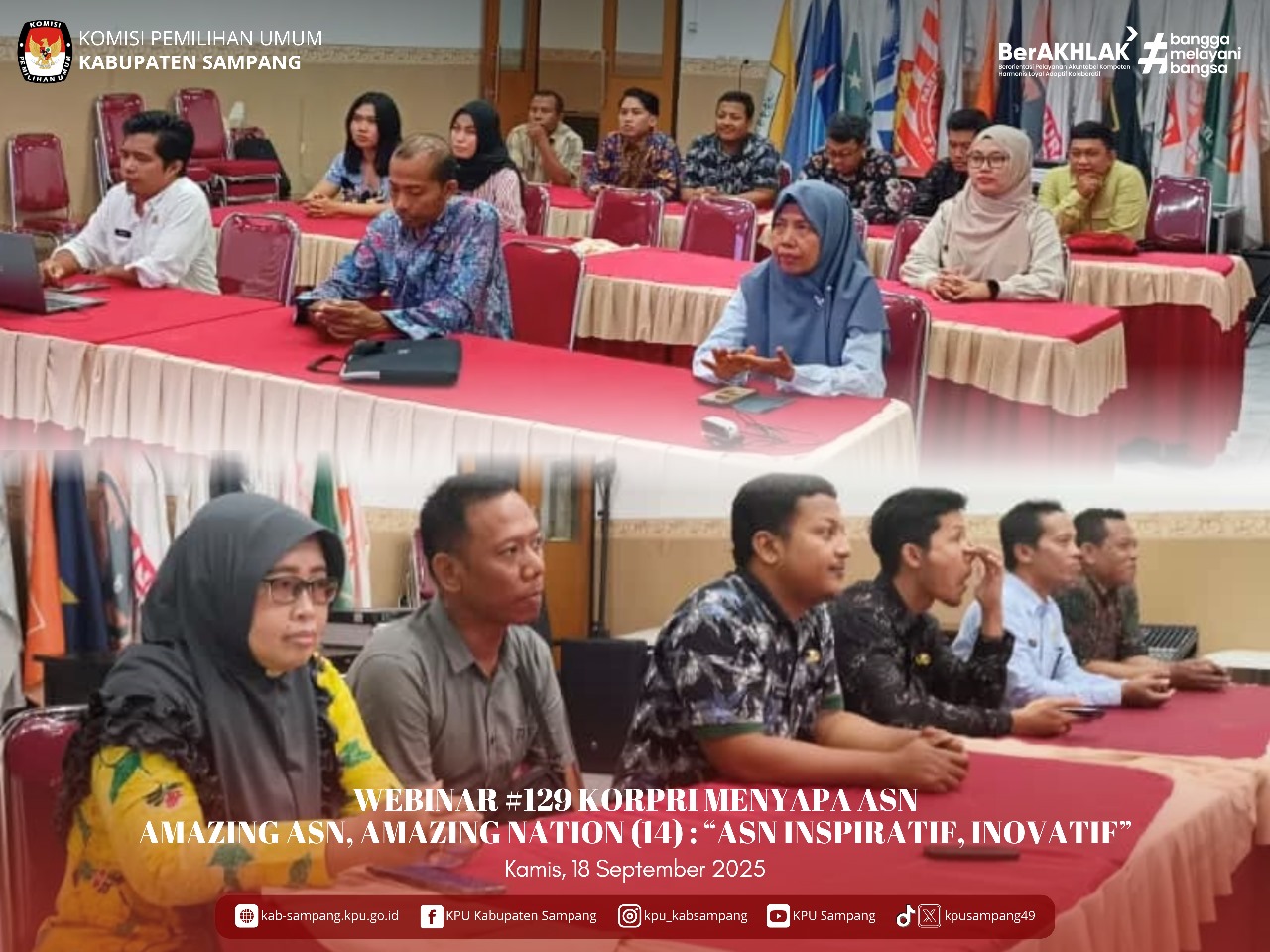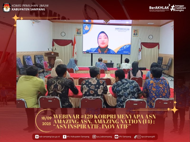 #TemanPemilih.... Hari ini Kamis, 18 September 2025, KPU Kabupaten Sampang mengikuti Webinar #129 KORPRI Menyapa ASN dengan tema: Amazing ASN, Amazing Nation (14): "ASN Inspiratif, Inovatif" melalui Zoom Meeting di Aula KPU Kabupaten Sampang.