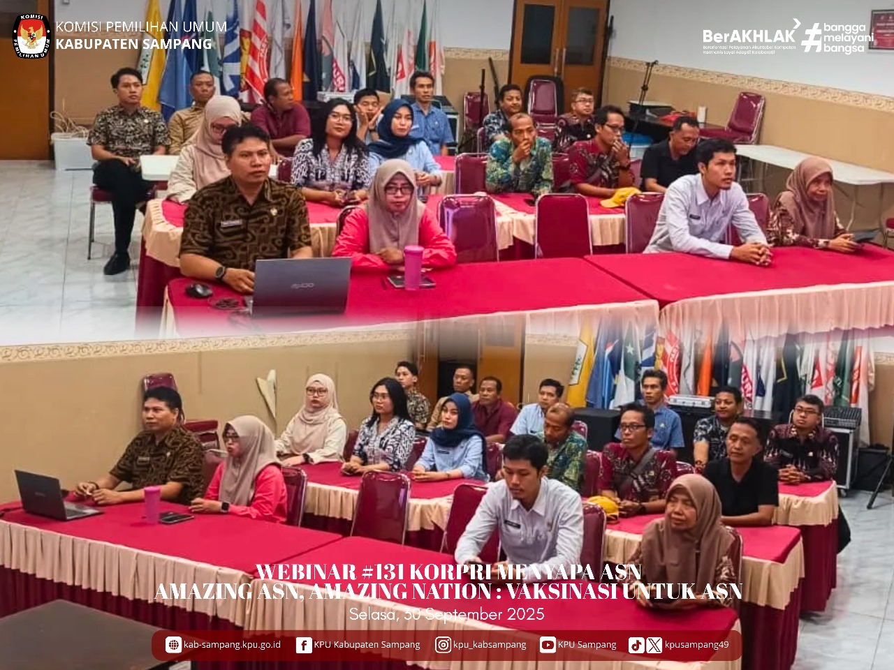 #TemanPemilih.... Hari ini Selasa, 30 September 2025, KPU Kabupaten Sampang mengikuti Webinar #131 KORPRI Menyapa ASN dengan tema: Amazing ASN, Amazing Nation (16): "Vaksinasi untuk ASN" melalui Zoom Meeting di Aula KPU Kabupaten Sampang.