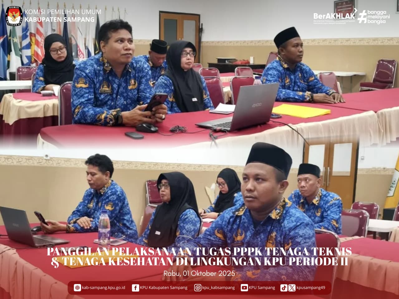 #TemanPemilih.... Hari ini Rabu, 01 Oktober 2025, KPU Kabupaten Sampang mengikuti kegiatan "Panggilan Melaksanakan Tugas Pegawai Pemerintah dengan Perjanjian Kerja (PPPK) Tenaga Teknis dan Tenaga Kesehatan di Lingkungan Sekretariat Jenderal KPU Tahun Anggaran 2024 Periode II" yang diselenggarakan oleh KPU Provinsi Jawa Timur secara daring melalui Zoom Meeting di Aula KPU Kabupaten Sampang.