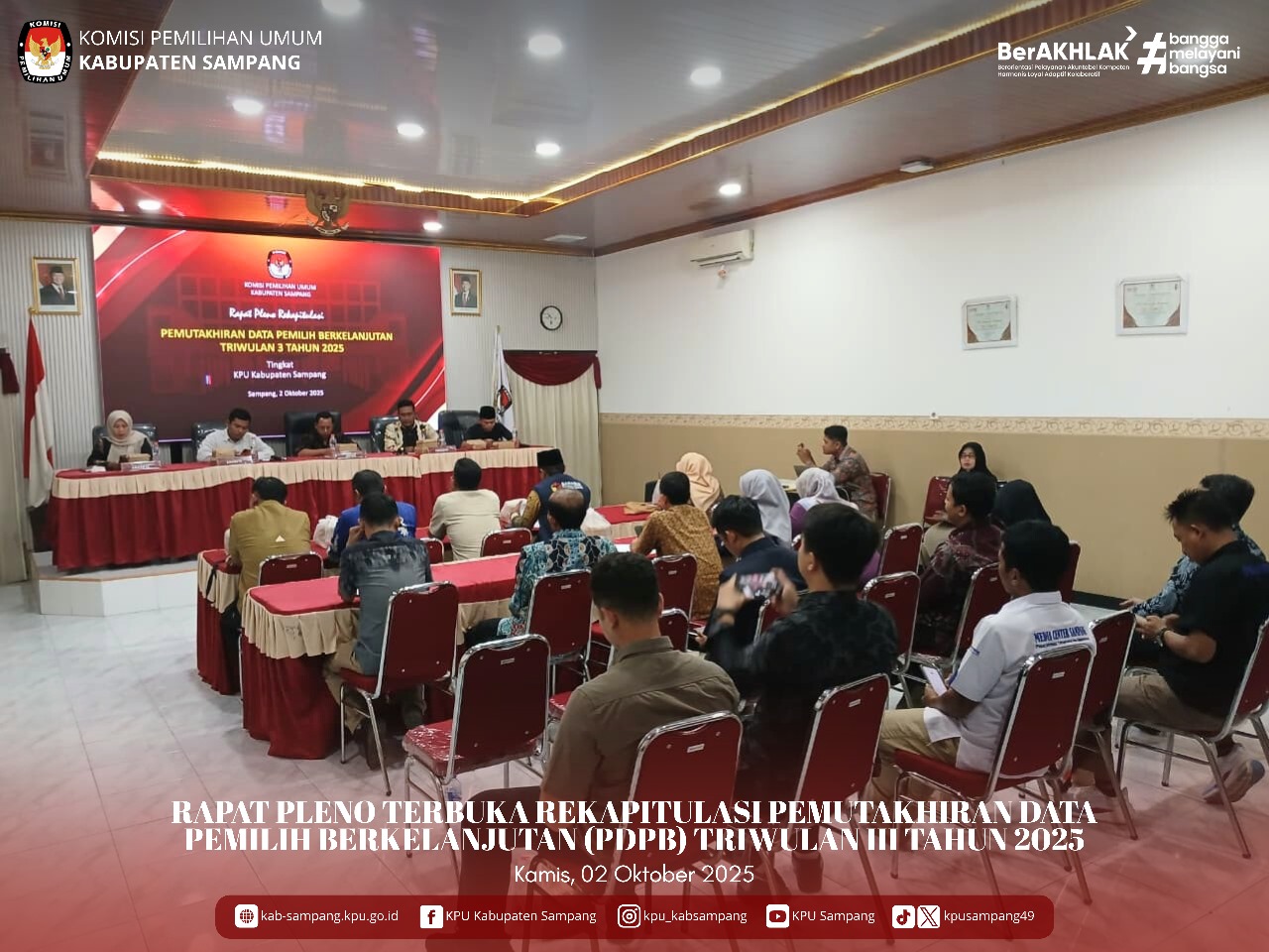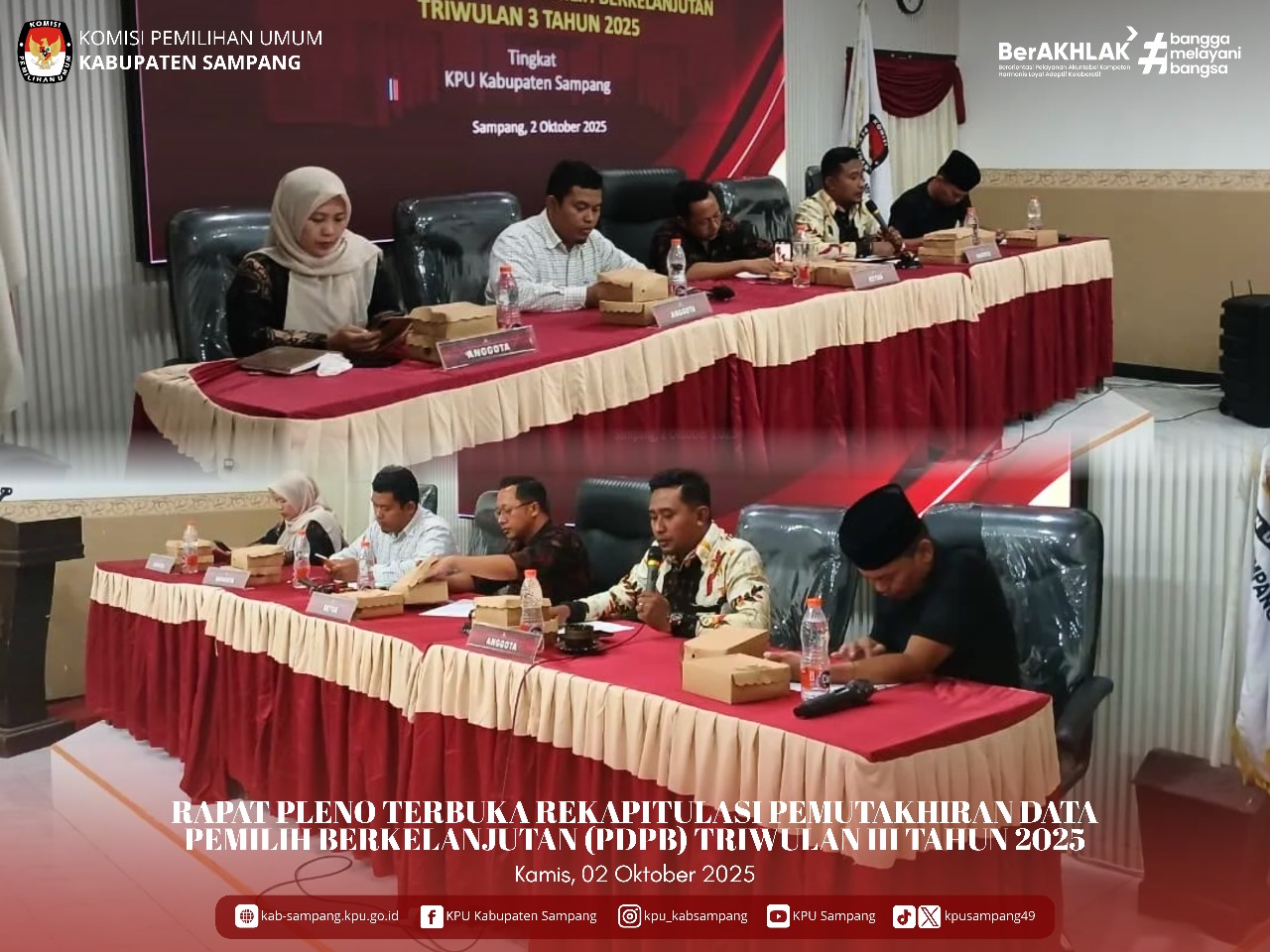 #TemanPemilih.... Hari ini Kamis, 02 Oktober 2025, KPU Kabupaten Sampang mengadakan Rapat Pleno Terbuka Rekapitulasi Pemutakhiran Data Pemilihan Berkelanjutan (PDPB) Triwulan III Tahun 2025 di Aula Kantor KPU Kabupaten Sampang.