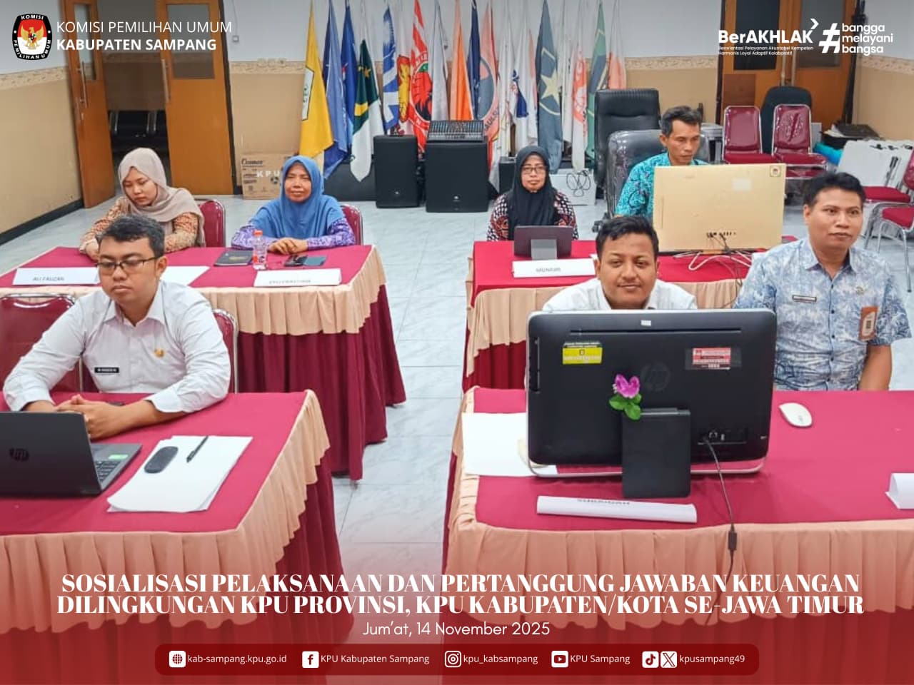 #TemanPemilih.... Hari ini Jum'at, 14 November 2025, KPU Kabupaten Sampang mengikuti Sosialisasi Pelaksanaan dan Pertanggungjawaban Keuangan dilingkungan KPU Provinsi, KPU Kabupaten/Kota Se-Jawa Timur secara daring melalui Zoom Meeting di Aula KPU Kabupaten Sampang.