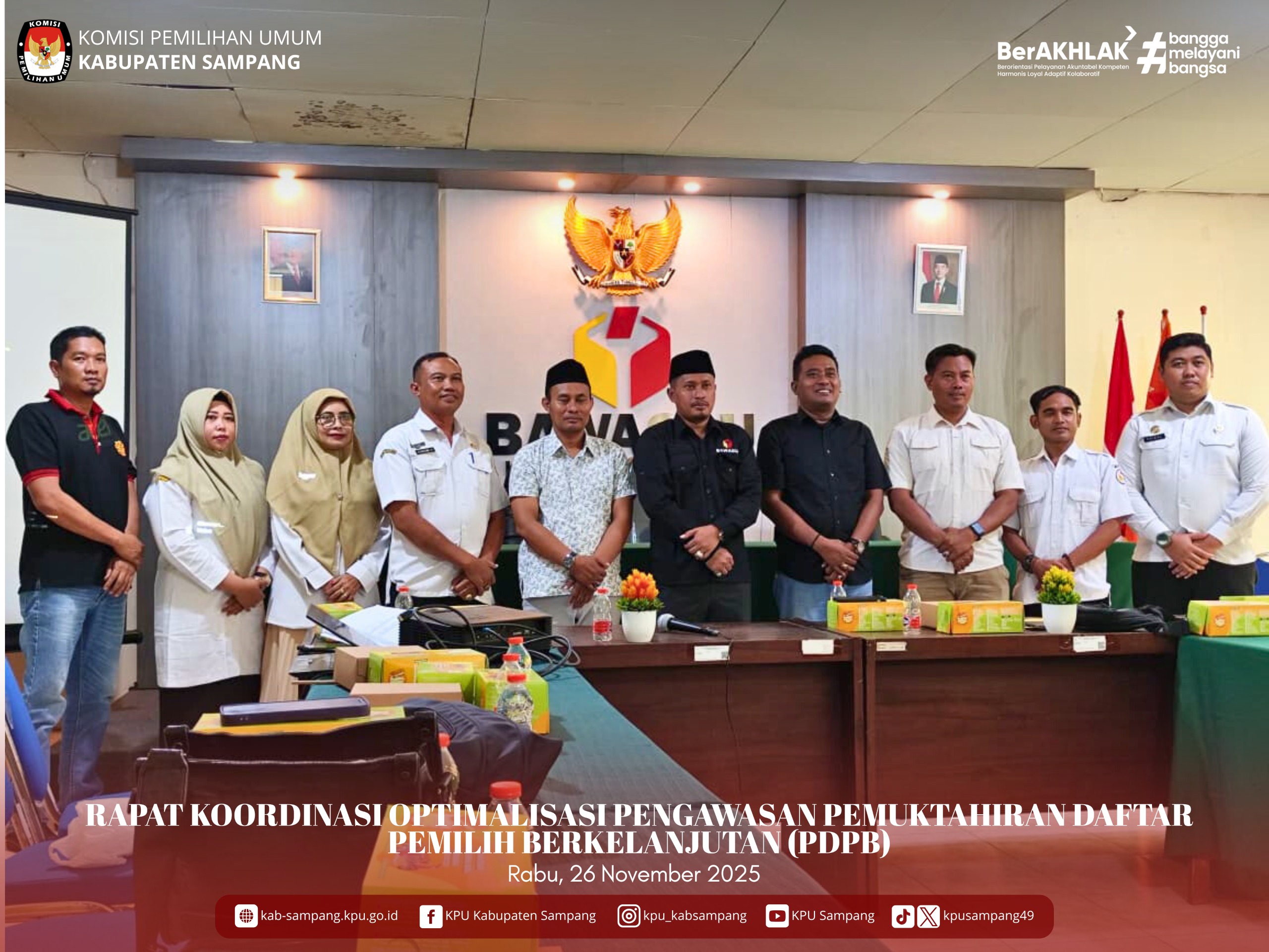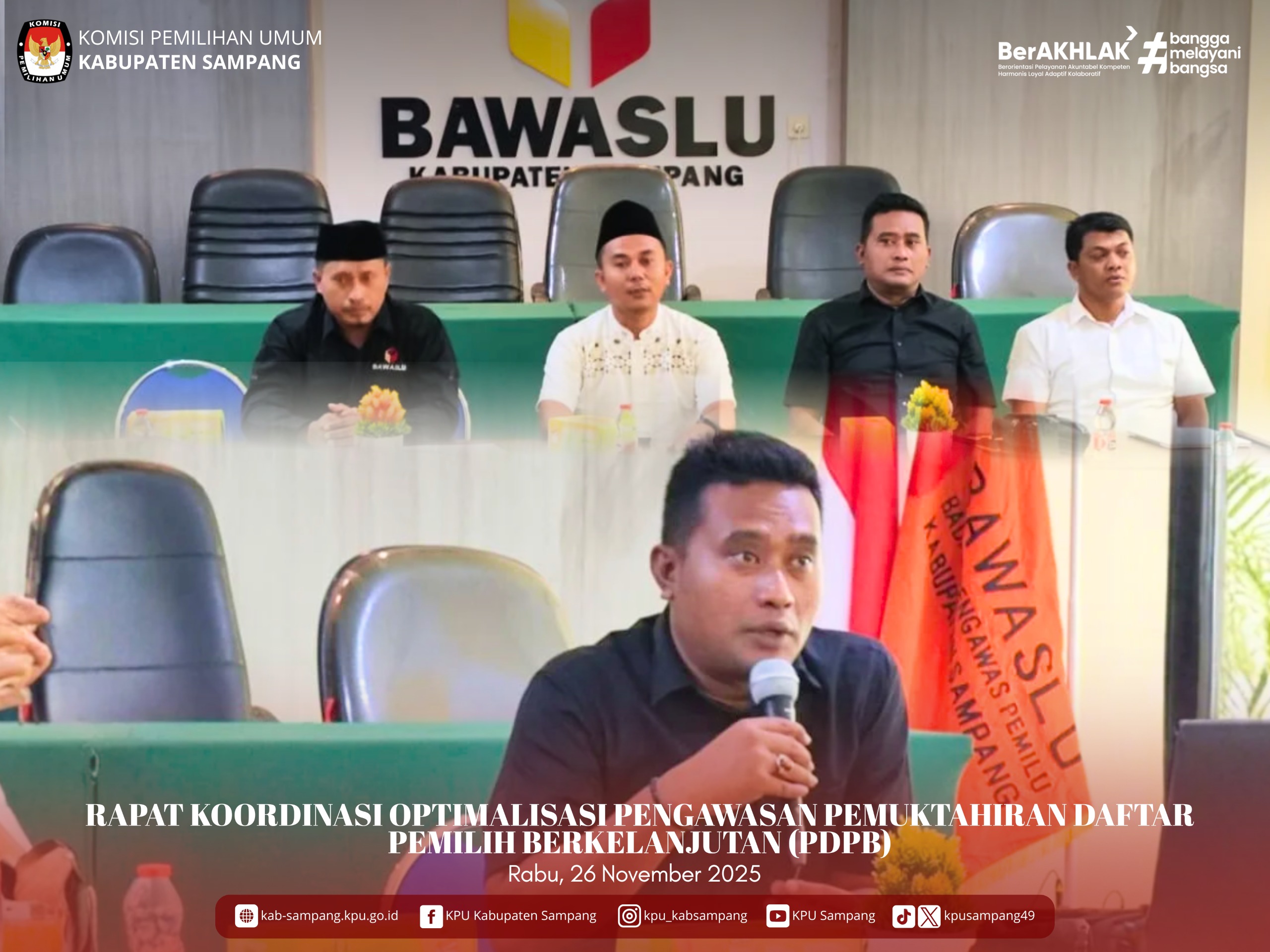 #TemanPemilih.... Hari ini, Rabu, 26 November 2025, Anggota KPU Kabupaten Sampang Divisi Perencanaan, Data, dan Informasi, Bapak Moh. Karimullah bersama dengan seorang staff KPU Kabupaten Sampang subbag Rendatin menghadiri Rapat Koordinasi Optimalisasi Pengawasan Pemuktahiran Daftar Pemilih Berkelanjutan (PDPB) yang diadakan oleh Bawaslu KPU Kabupaten Sampang secara luring di Aula Kantor Bawaslu Kabupaten Sampang.