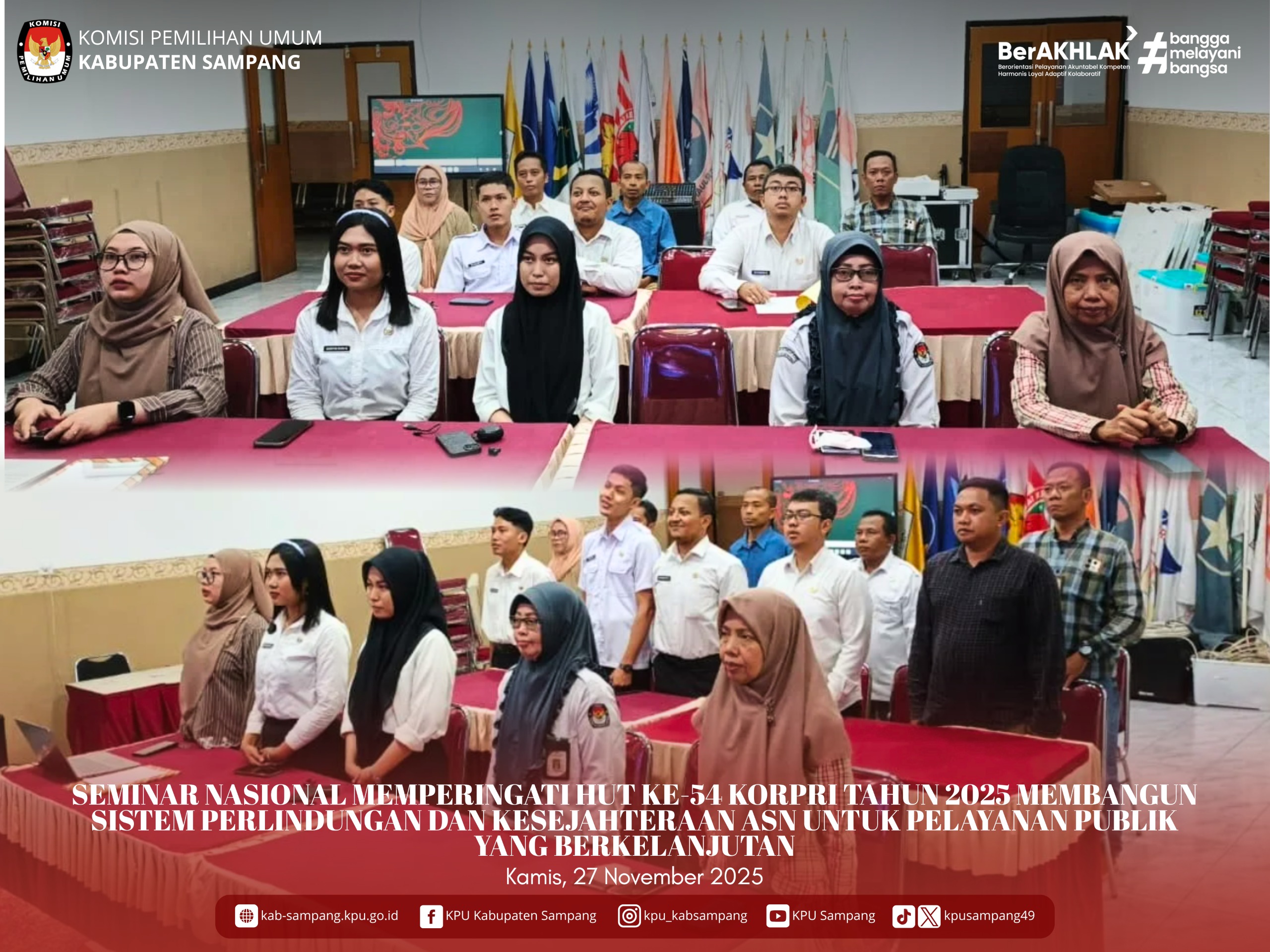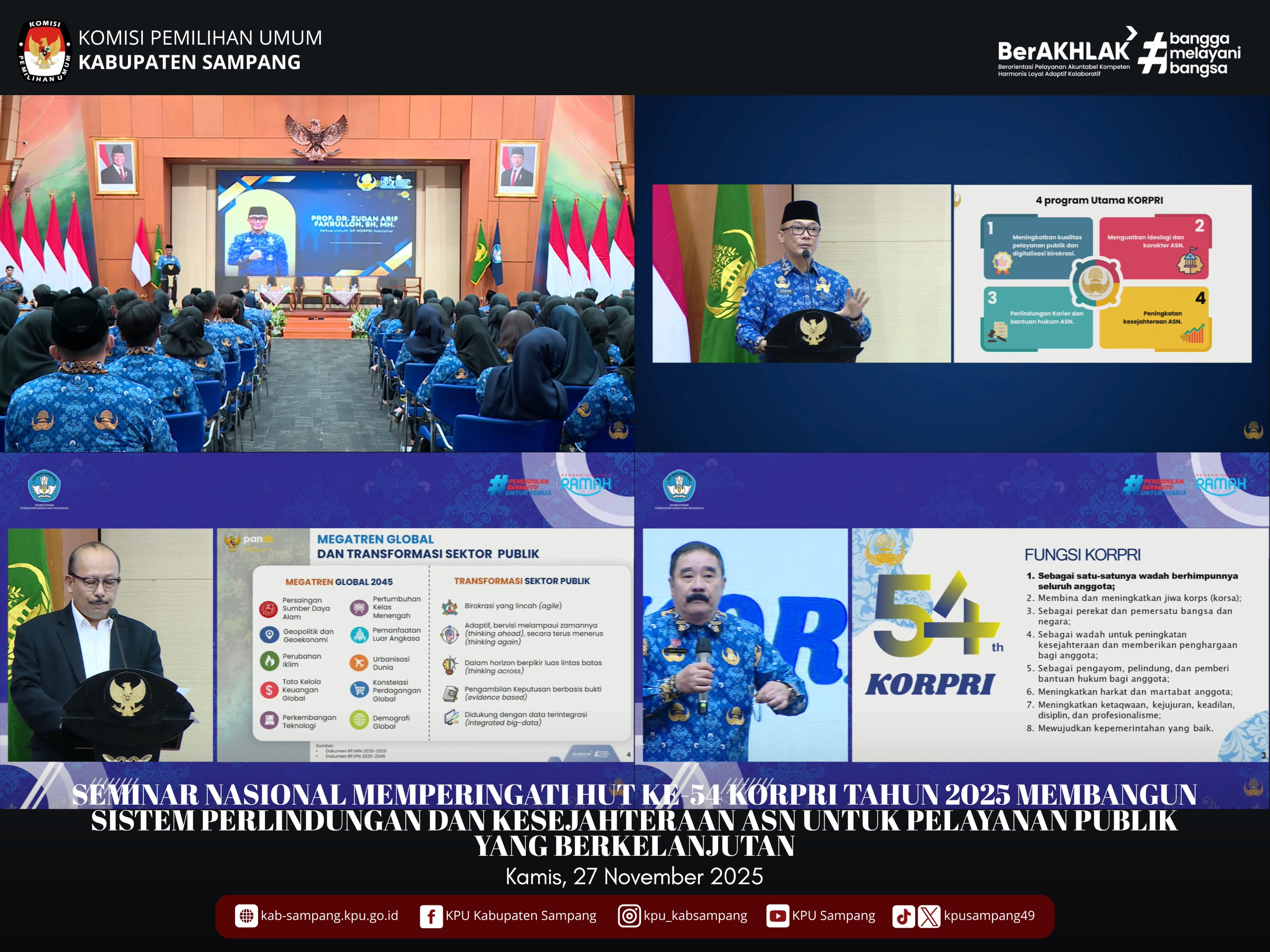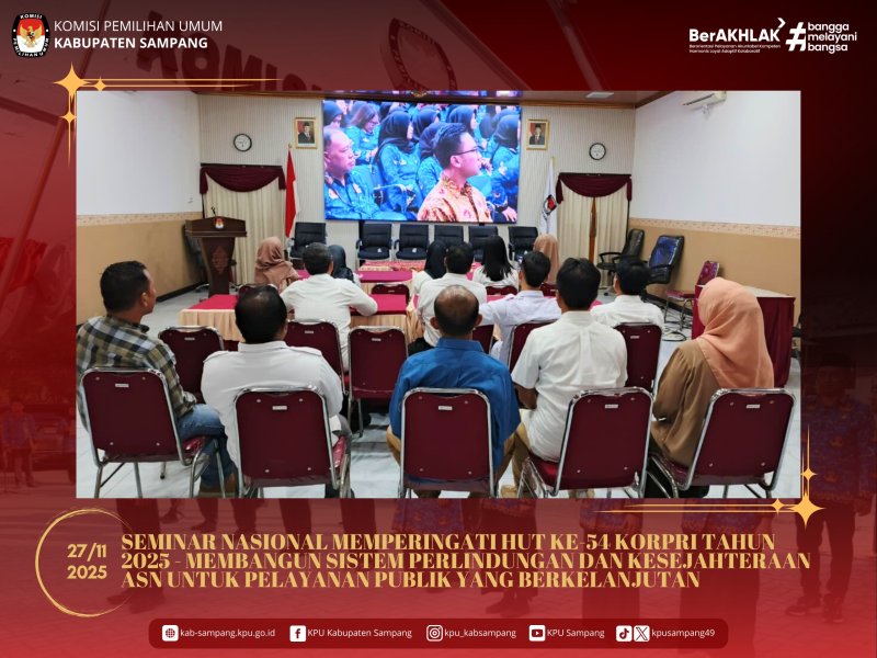 #TemanPemilih.... Hari ini Kamis, 27 November 2025, KPU Kabupaten Sampang mengikuti Seminar Nasional Memperingati HUT ke-54 KORPRI Tahun 2025 - "Membangun Sistem Perlindungan dan Kesejahteraan ASN untuk Pelayanan Publik yang Berkelanjutan" melalui Zoom Meeting di Aula Kantor KPU Kabupaten Sampang.