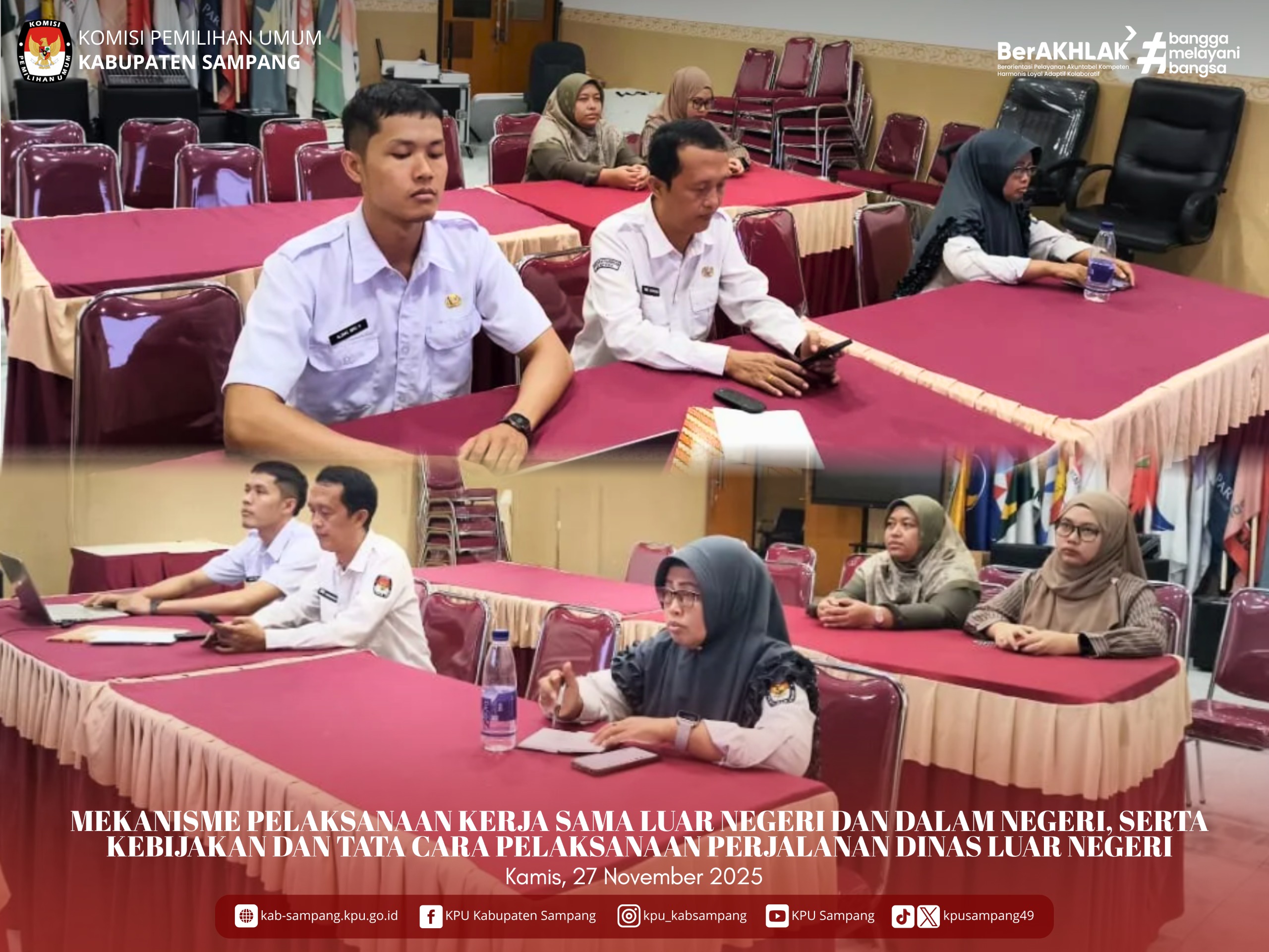 #TemanPemilih.... KPU Kabupaten Sampang telah mengikuti Diskusi Kelompok Terpumpun yang membahas mengenai “Mekanisme Pelaksanaan Kerja Sama Luar Negeri dan Dalam Negeri serta Kebijakan dan Tata Cara Pelaksanaan Perjalanan Dinas Luar Negeri.” secara daring melalui Zoom Meeting di Aula KPU Kabupaten Sampang. Diskusi ini dilaksanakan pada hari Kamis, 27 November 2025.