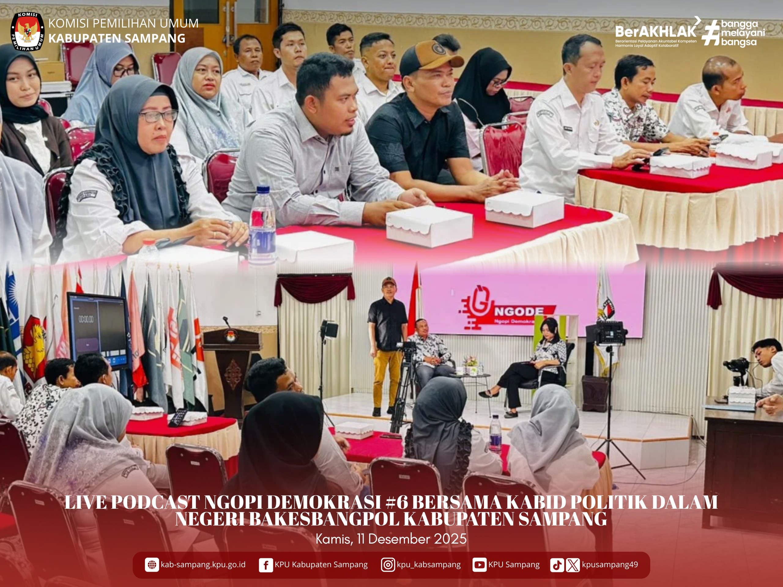 #TemanPemilih... KPU Kabupaten Sampang telah melakukan LIVE Podcast KPU Kabupaten Sampang, Podcast Ngopi Demokrasi (NGODE) Episode #6, pada Hari ini, Kamis, 11 Desember 2025. Podcast Ngopi Demokrasi kali ini mengangkat tema "Sinergi Pemilu : Jaga Suara, Jaga Negara" dengan narasumber yang sangat spesial pada kesempatan kali ini, yaitu, Bapak Bambang Maryono. Beliau merupakan Kepala Bidang Politik Dalam Negeri Bakesbangpol Kab. Sampang.