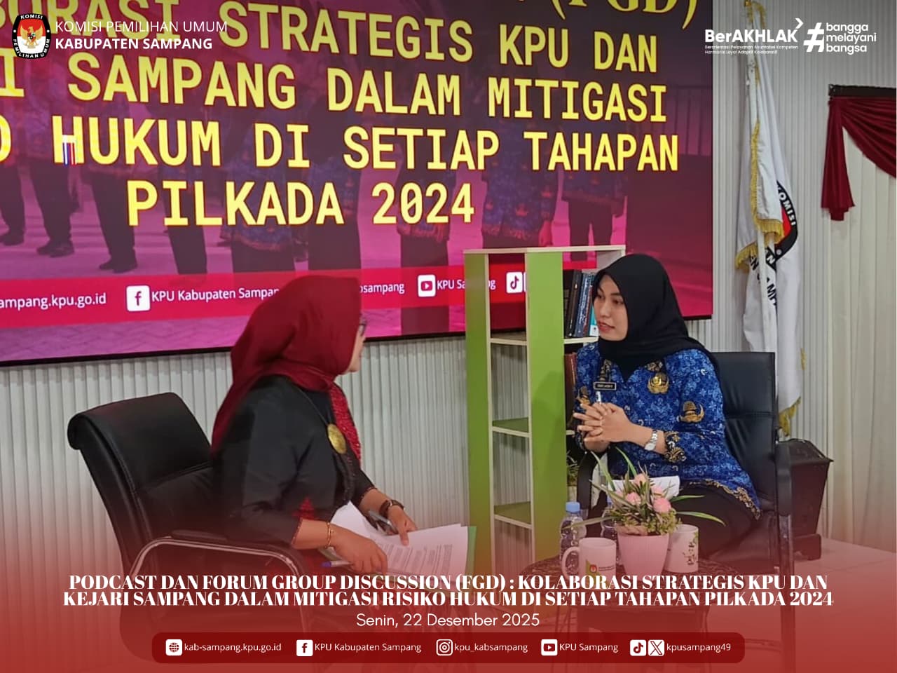#TemanPemilih... KPU Kabupaten Sampang telah melakukan LIVE Podcast KPU Kabupaten Sampang, Podcast Ngopi Demokrasi (NGODE) Episode #10 sekaligus Forum Group Discudsion, pada Hari Senin, 22 Desember 2025. Podcast Ngopi Demokrasi dan FGD kali ini mengangkat tema "Sinergi Jaksa & Penyelenggara: Menjaga Suara Rakyat Sampang" dengan narasumber yang sangat spesial pada kesempatan kali ini, yaitu, Fadilah Helmi, S.H., M.H., CSSL. Beliau merupakan Kepala Kejaksaan Negeri Sampang. Live Podcast dan FGD ini juga dihadiri oleh seluruh komisioner beserta seluruh pegawai kesekretariatan KPU Kabupaten Sampang.