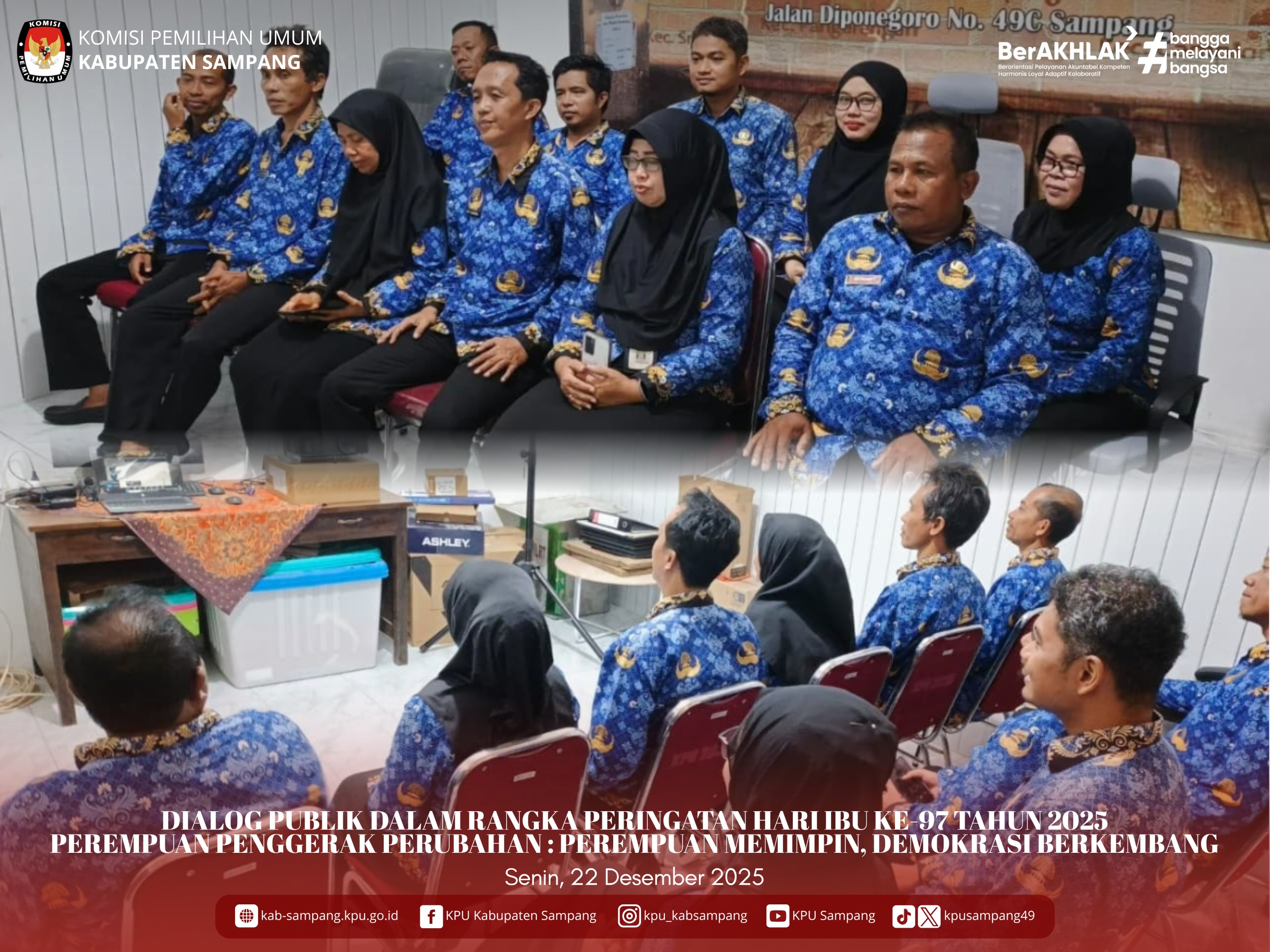 #TemanPemilih.... Hari ini Senin, 22 Desember 2025, KPU Kabupaten Sampang mengikuti Dialog Publik Dalam Rangka Peringatan Hari Ibu Ke-97 Tahun 2025 “Perempuan Penggerak Perubahan : Perempuan Memimpin, Demokrasi Berkembang” secara daring melalui Zoom Meeting di Kantor KPU Kabupaten Sampang.