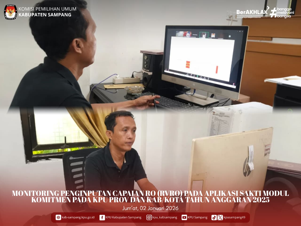 #TemanPemilih.... Hari ini, Jum'at, 02 Januari 2026, KPU Kabupaten Sampang mengikuti Monitoring Penginputan Capaian RO (RVRO) pada Aplikasi Sakti Modul Komitmen pada KPU Provinsi dan KPU kabupaten/Kota Tahun Anggaran 2025 secara daring, melalui Zoom Meeting, di Kantor KPU Kabupaten Sampang.