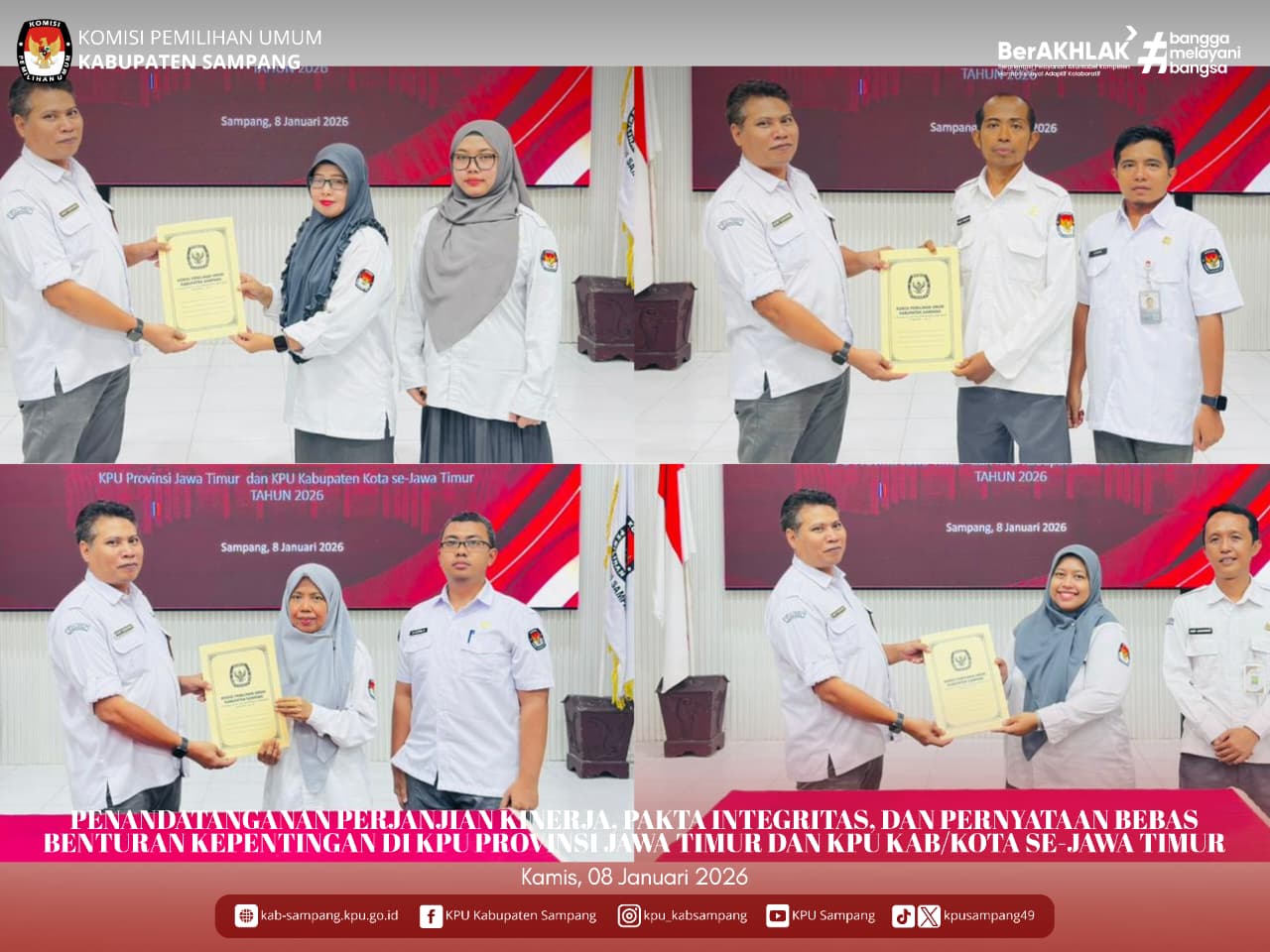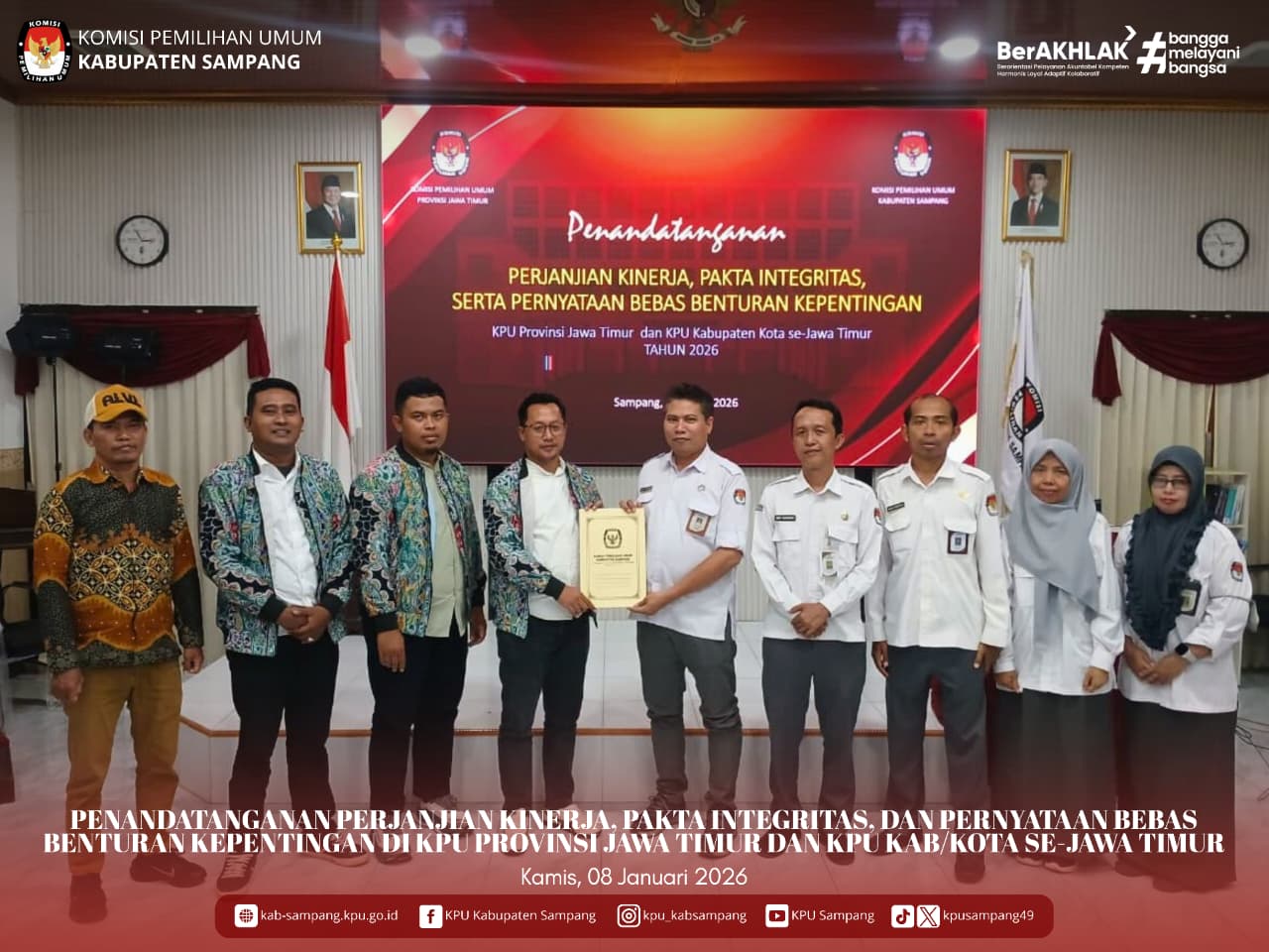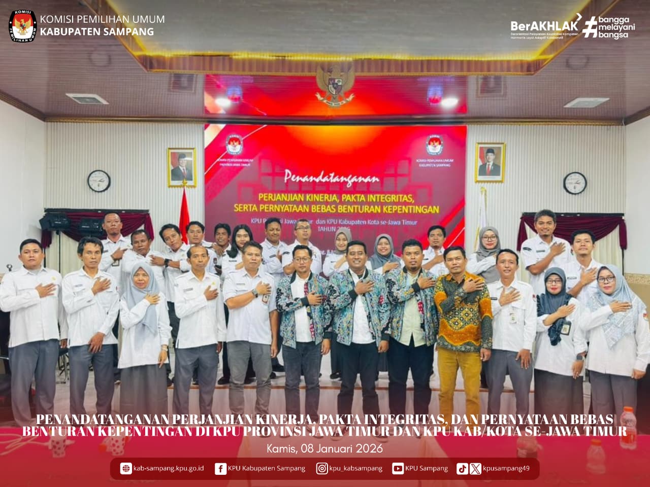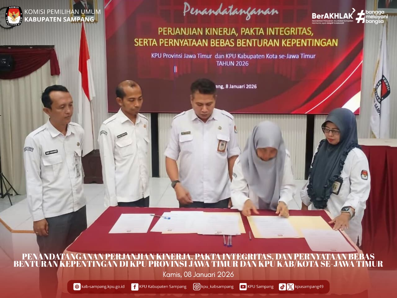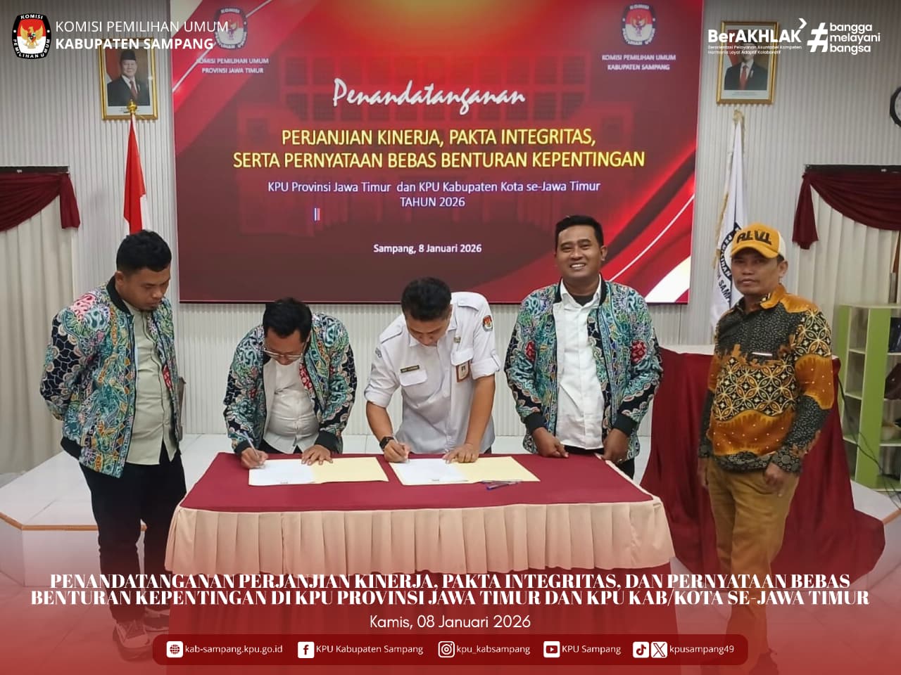 #TemanPemilih.... Hari ini, Kamis, 08 Januari 2026, KPU Kabupaten Sampang mengikuti Penandatangan Perjanjian Kinerja, Pakta Integritas, dan Pernyataan Bebas Benturan Kepentingan di Aula Kantor KPU Kabupaten Sampang.