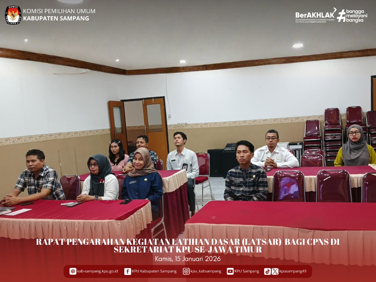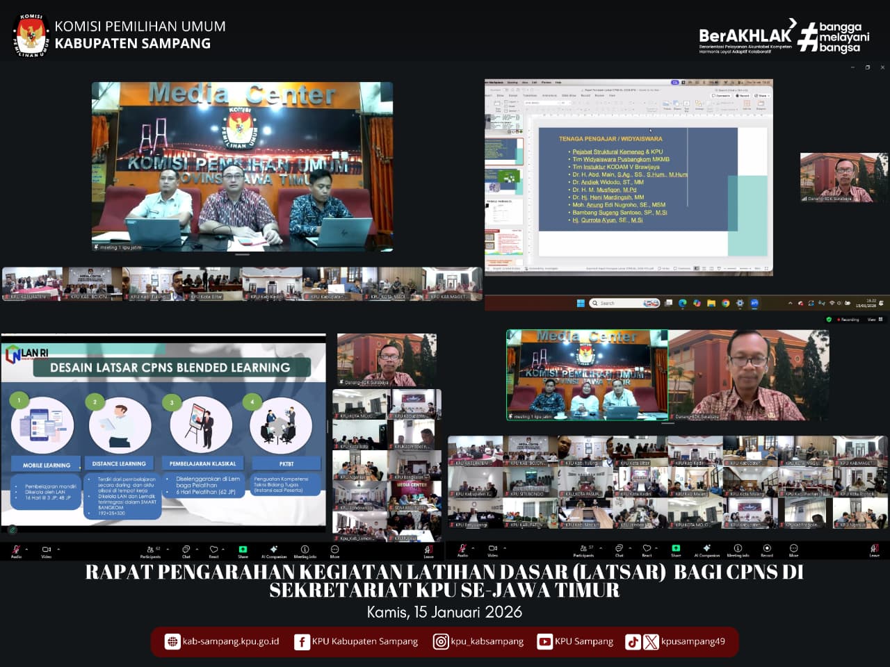 #TemanPemilih.... Hari ini, Kamis, 15 Januari 2026, KPU Kabupaten Sampang mengikuti Rapat Pengarahan Kegiatan Latihan Dasar (Latsar) bagi CPNS Sekretariat KPU se-Jawa Timur, secara daring, di Aula KPU Kabupaten Sampang.