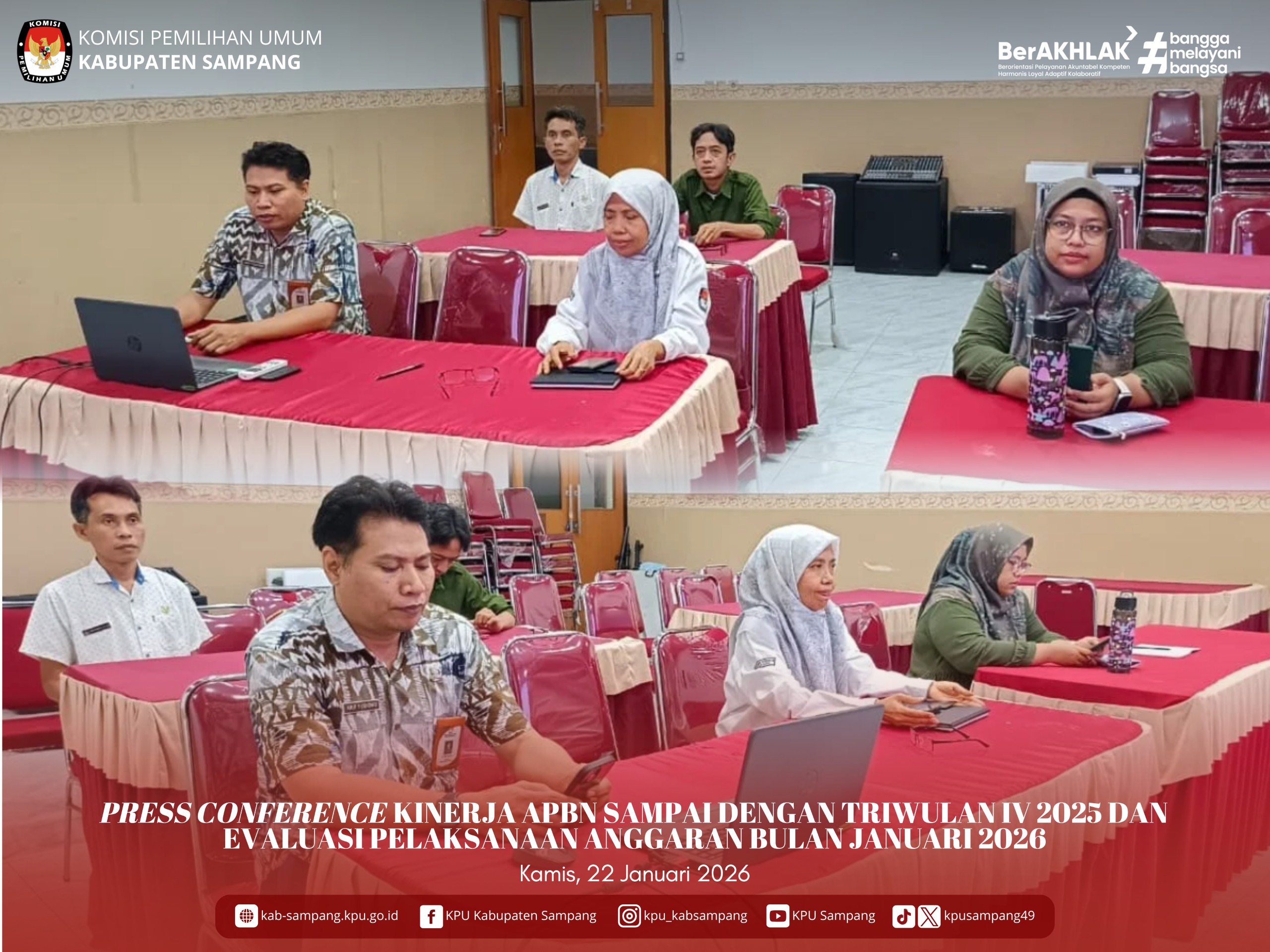 #TemanPemilih.... Hari ini, Kamis, 22 Januari 2026, KPU Kabupaten Sampang Mengikuti Kegiatan Press Conference Kinerja APBN sampai dengan Triwulan IV 2025 dan Evaluasi Pelaksanaan Anggaran Bulan Januari 2026, secara daring, di Aula KPU Kabupaten Sampang. Kegiatan ini diikuti oleh Sekretaris KPU Kabupaten Sampang, bapak Arif Yudiono, Kasubbag KUL beserta staff pengelola keuangan.