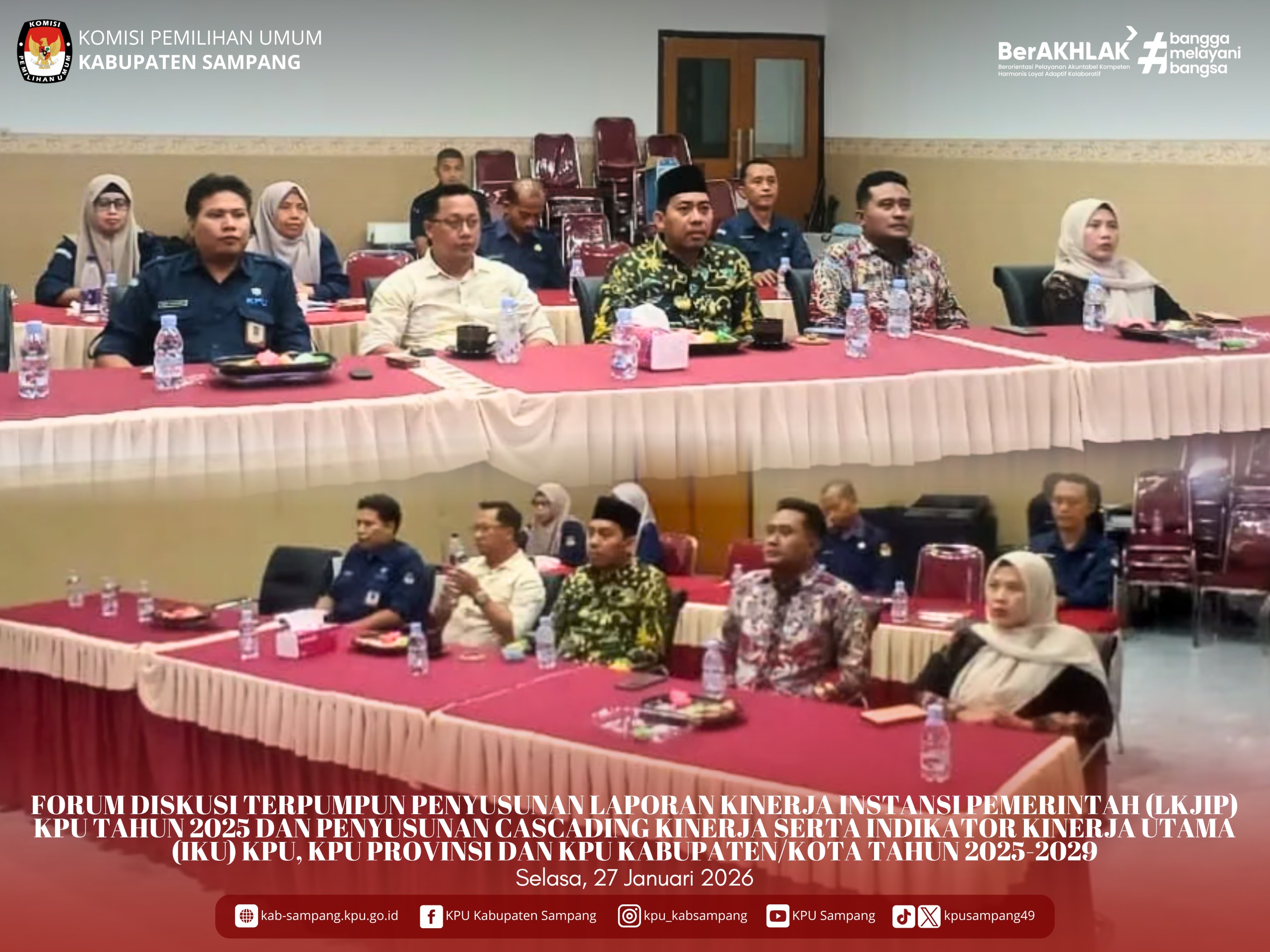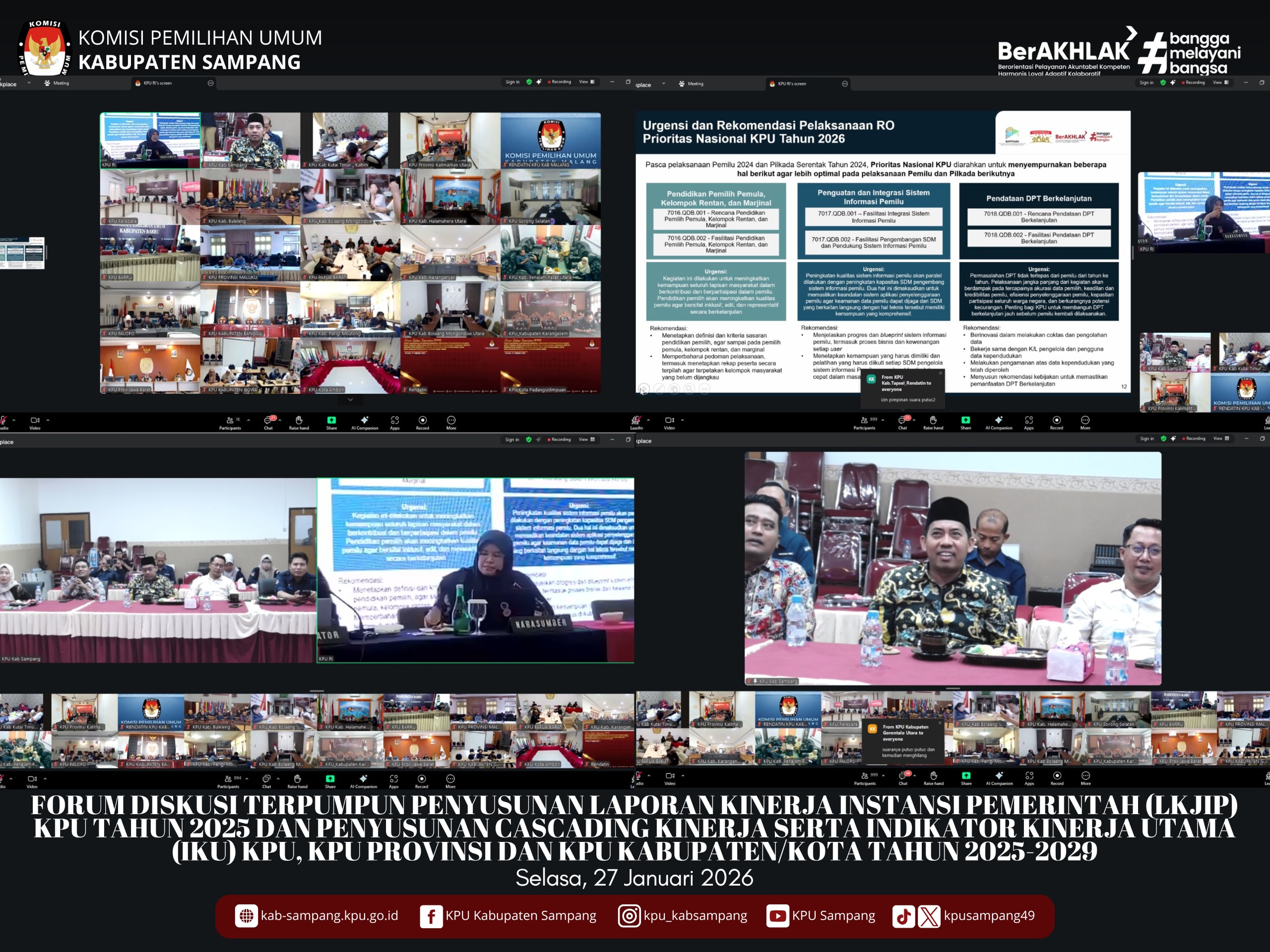 #TemanPemilih.... KPU Kabupaten Sampang telah mengikuti Kegiatan Forum Diskusi Terpumpun (FDT) Penyusunan Laporan Kinerja Instansi Pemerintah (LKjIP) KPU Tahun 2025 dan Penyusunan Cascading Kinerja Serta Indikator Kinerja Utama (IKU) KPU, KPU Provinsi dan KPU Kabupaten/Kota Tahun 2025-2029 pada hari Selasa, 27 Januari 2026, secara daring, di Aula KPU Kabupaten Sampang.