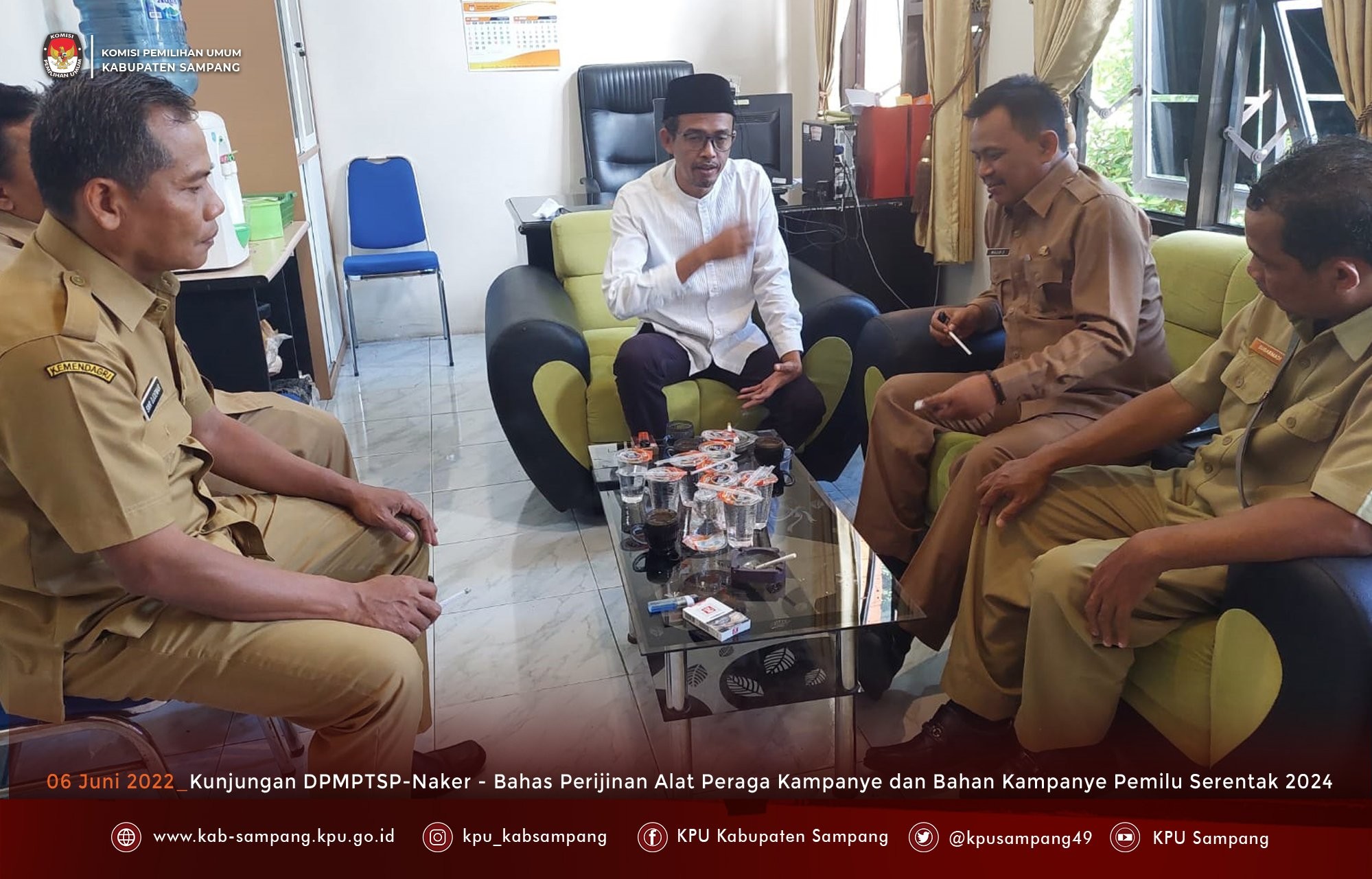 Menjelang Pemilu Serentak Tahun 2024, dinas yang melayani perijinan, yakni Dinas Penanaman Modal, Pelayanan Terpadu Satu Pintu, dan Tenaga Kerja (DPMPTSP-Naker) Kabupaten Sampang mendatangi KPU Kabupaten Sampang. Dalam kedatangannya, DPMPTSP-Naker membahas soal perijinan pemasangan Alat Peraga Kampanye dan Bahan Kampanye Pemilu Serentak Tahun 2024.