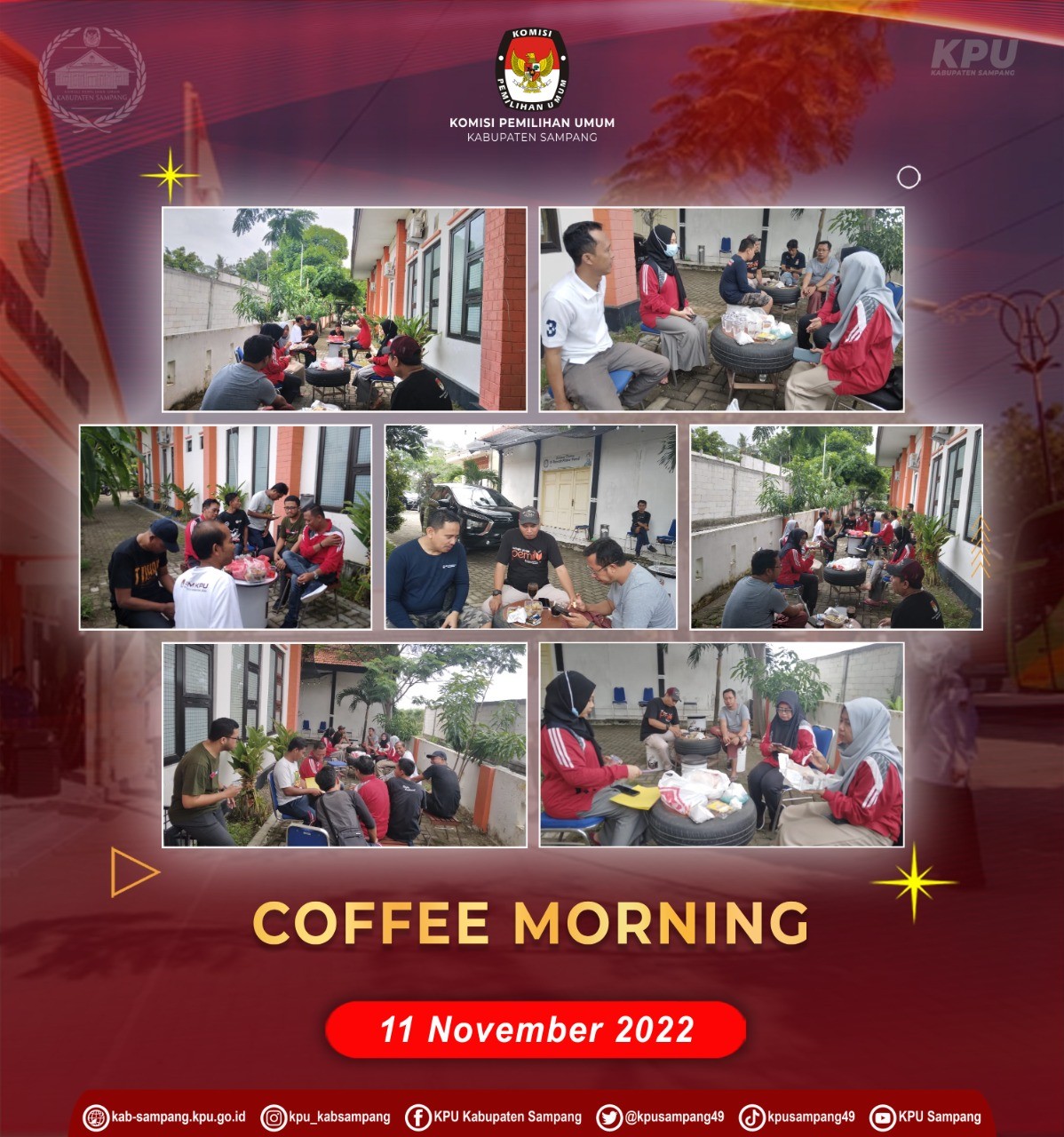 Sampang, kab-sampang.kpu.go.id – KPU Kabupaten Sampang menggelar Coffee Morning, Jumat pagi (11/11/22) di Café Integritas yang terletak di halaman belakang Kantor KPU Kabupaten Sampang yang diikuti oleh Sekretaris, Ka Subbag, dan Staf.