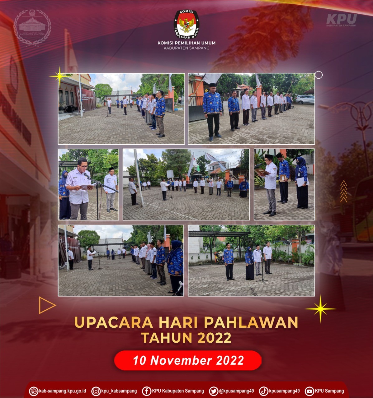 Upacara yang mengambil tema Pahlawanku Teladanku tersebut dilaksanakan atas perintah KPU RI melalui Surat Nomor 1061PK.02.1-SD/04/2022 Prihal Upacara Peringatan Hari Pahlawan Tahun 2022 dan Surat Mensos RI Nomor S-86/MS/B/PB.06.00/11/2022 Prihal Upacara Peringatan Hari Pahlawan serta Pedoman Peringatan Hari Pahlawan tanggal 10 November 2022.