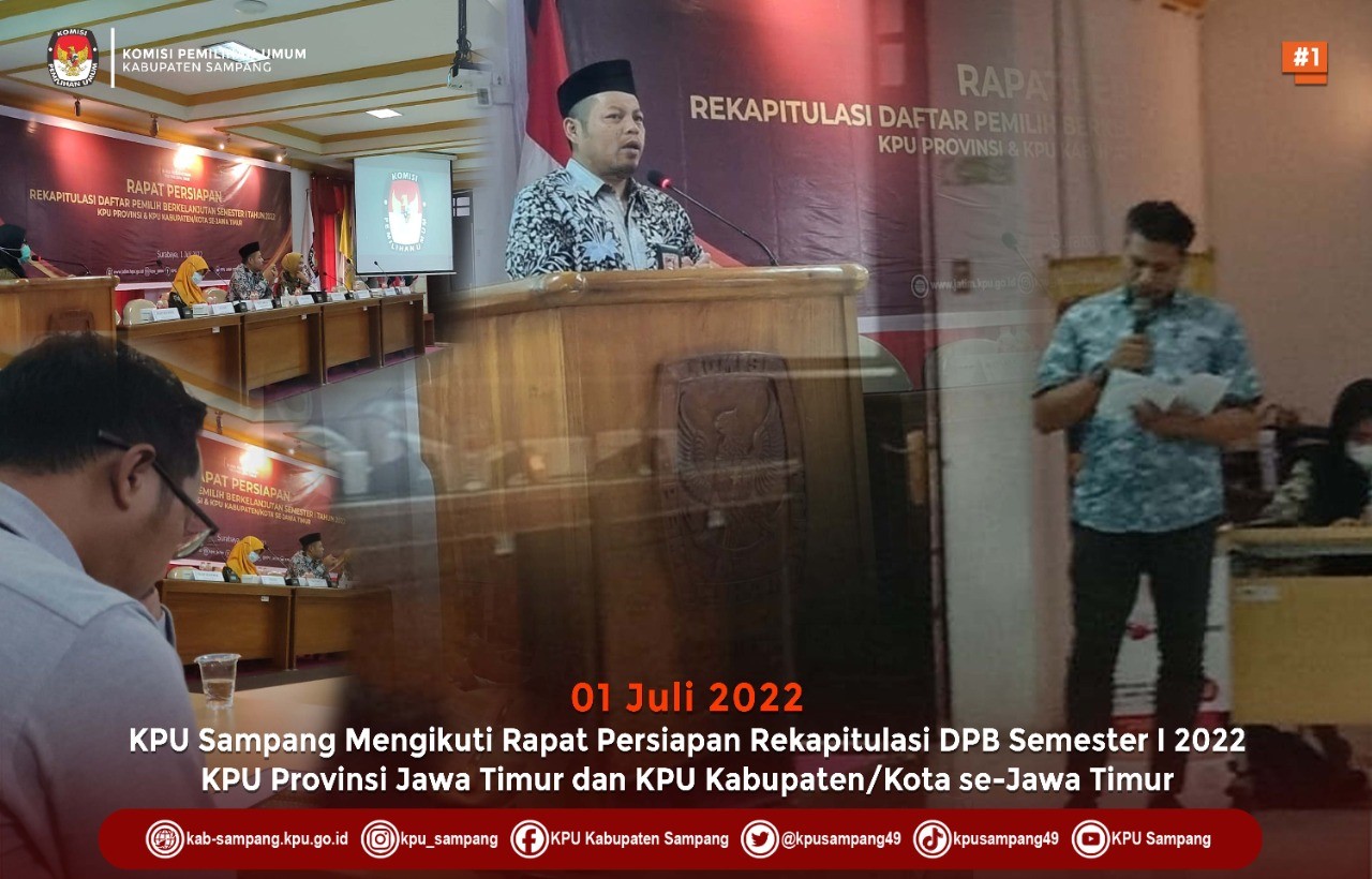 Surabaya, kab-sampang@kpu.go.id - (1/7/22) KPU Provinsi Jawa Timur melaksanakan Rakoor Daftar Pemilih Berkelanjutan (DPB) Semester I tahun 2022 bersama Kabupaten/ Kota se Jawa Timur. Rakoor juga dihadiri oleh Bawaslu Provinsi Jawa Timur , instansi pemerintahan Provinsi, TNI, Polri dan juga perwakilan Partai Politik.