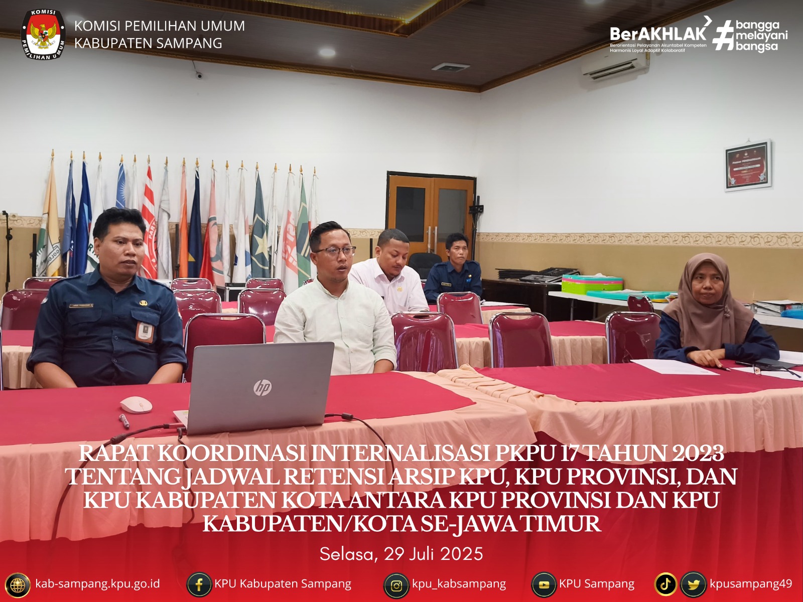 #TemanPemilih.... Hari ini Selasa, 29 Juli 2025, KPU Kabupaten Sampang mengikuti Rapat Koordinasi Internalisasi Peraturan Komisi Pemilihan Umum Nomor 17 Tahun 2023 tentang Jadwal Retensi Arsip yang diselenggarakan oleh KPU Provinsi Jawa Timur secara daring melalui zoom meeting di Aula KPU Kabupaten Sampang. Kegiatan ini diikuti oleh Ketua, Sekretaris, Kepala dan staff Sub bagian Keuangan, Umum, dan Logistik (KUL) KPU Kabupaten Sampang.