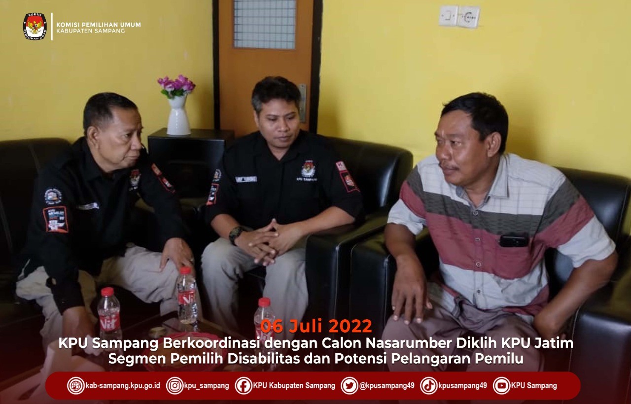 Sampang, kab-sampang@kpu.go.id - Rabu (06/07/22), KPU Kabupaten Sampang mengundang Ketua Perkumpulan Penyandang Disabilitas Indonesia (PPDI) Kabupaten Sampang untuk mendiskusikan kegiatan yang akan diselenggarakan pada tanggal 14 Juli 2022 mendatang, yakni Pendidikan Pemilih KPU Provinsi Jawa Timur di Sampang dengan segmen pemilih disabilitas dan daerah potensi pelanggaran pemilu.