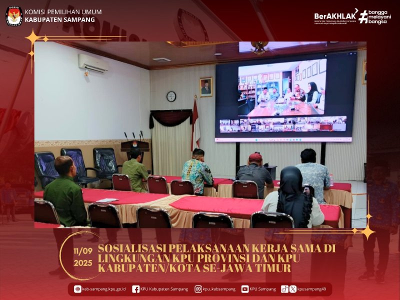#TemanPemilih.... Hari ini Kamis, 11 September 2025, KPU Kabupaten Sampang mengikuti Sosialisasi Pelaksanaan Kerja Sama di Lingkungan KPU Provinsi dan KPU Kabupaten/Kota Se-Jawa Timur secara daring melalui Zoom Meeting di Aula KPU Kabupaten Sampang.