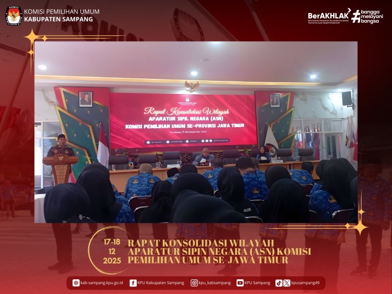 #TemanPemilih.... KPU Kabupaten Sampang telah mengikuti Rapat Konsolidasi Wilayah Aparatur Sipil Negara (ASN) Komisi Pemilihan Umum se-Provinsi Jawa Timur yang diselenggarakan oleh KPU Provinsi Jawa Timur pada Rabu-Kamis, 17-18 Desember 2025, secara luring, bertempat di Kantor KPU Provinsi Jawa Timur, Jalan Raya Tenggilis Nomor 1–3, Surabaya.