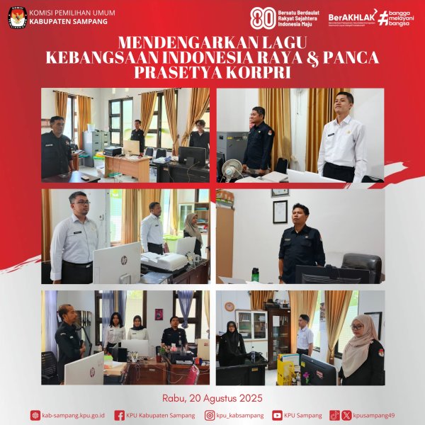 #TemanPemilih.... Hari ini Rabu, 20 Agustus 2025, KPU Kabupaten Sampang Mendengarkan Lagu Kebangsaan Indonesia Raya dan Panca Prasetya Korpri di Kantor KPU Kabupaten Sampang