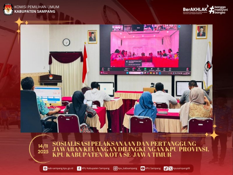 #TemanPemilih.... Hari ini Jum'at, 14 November 2025, KPU Kabupaten Sampang mengikuti Sosialisasi Pelaksanaan dan Pertanggungjawaban Keuangan dilingkungan KPU Provinsi, KPU Kabupaten/Kota Se-Jawa Timur secara daring melalui Zoom Meeting di Aula KPU Kabupaten Sampang.