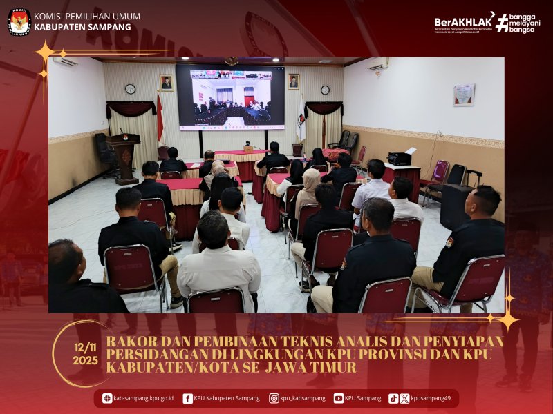 #TemanPemilih.... KPU Kabupaten Sampang telah mengikuti Rapat Koordinasi dan Pembinaan Teknis Analisis serta Penyiapan Persidangan yang diadakan secara daring melalui Zoom Meeting di Aula KPU Kabupaten Sampang pada hari Rabu, 12 November 2025. Kegiatan ini diikuti oleh seluruh Sekretariat KPU Provinsi dan Kabupaten/Kota se-Jawa Timur.
