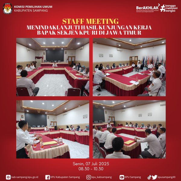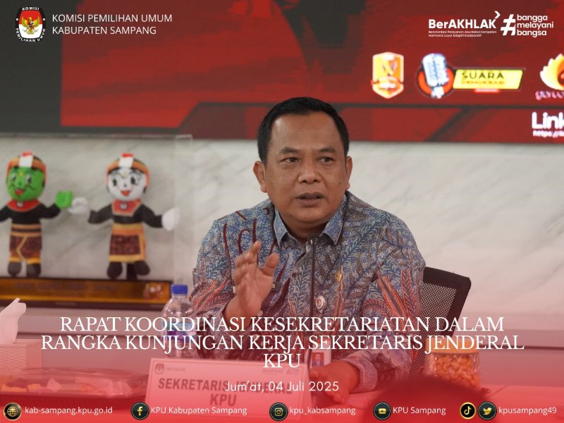 #TemanPemilih.....Sekretaris Komisi Pemilihan Umum Kabupaten Sampang Arif Yudiono menghadiri Rapat Koordinasi Kesekretariatan Dalam Rangka Kunjungan Kerja Sekretaris Jenderal KPU di Aula KPU Kota Malang, JI. Bantaran No. 6, Blimbing, Kota Malang, pada Jumat, 4 Juli 2025. Sekretaris Jenderal KPU, Bernad Dermawan Sutrisno dalam arahannya kepada Sekretaris KPU Kabupaten/ Kota untuk untuk terus meningkatkan kinerja kelembagaan dan soliditas, terlebih lagi pasca tahapan Pemilu dan Pilkada Serentak Tahun 2024. Khusus juga untuk CPNS dan PPPK di seluruh Jawa Timur diharapkan untuk bekerja dengan sebaik-baiknya dan banyak belajar untuk hasil yang lebih baik. Deputi Administrasi, Suryadi juga mengungkapkan bahwa tujuan kunjungan kerja Sekretaris Jenderal salah satunya adalah melakukan pemetaan SDM di masa yang akan datang dalam rangka menyambut tahapan pada Pemilu dan Pilkada mendatang. Hadir dalam kegiatan ini Sekretaris Jenderal KPU, Bernad Dermawan Sutrisno, Deputi Bidang Administrasi, Suryadi, Sekretaris KPU Jatim, Nanik Karsini, beserta seluruh Sekretaris KPU Kabupaten/Kota se-Jawa Timur.