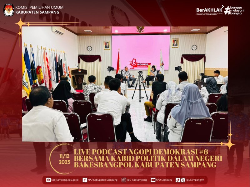 #TemanPemilih... KPU Kabupaten Sampang telah melakukan LIVE Podcast KPU Kabupaten Sampang, Podcast Ngopi Demokrasi (NGODE) Episode #6, pada Hari ini, Kamis, 11 Desember 2025. Podcast Ngopi Demokrasi kali ini mengangkat tema "Sinergi Pemilu : Jaga Suara, Jaga Negara" dengan narasumber yang sangat spesial pada kesempatan kali ini, yaitu, Bapak Bambang Maryono. Beliau merupakan Kepala Bidang Politik Dalam Negeri Bakesbangpol Kab. Sampang.