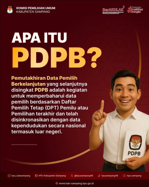 #TemanPemilih..... hari ini Senin, 23 Juni 2025, Hai. .. warga Kabupaten Sampang Kamu belum terdaftar sebagai PEMILIH? Segera laporkan dengan ketentuan sebagai berikut: - Pemilih Pemula (baru berusia 17 tahun) - Mengalami Perubahan Identitas Kependudukan - Keluarga Yang Sudah Meninggal Perubahan Status Menjadi Anggota TNI/Polri Aktif/Purnatugas - WNI yang dicabut Hak Politiknya oleh Pengadilan dengan Putusan Inkrah. SEGERA LAPOR KE: KANTOR KPU KABUPATEN SAMPANG JI. Diponegoro, Kel.Banyuanyar, Kec. Sampang (69216) Jangan lupa cek Nomor Induk Kependudukan (NIK) anda di: cekdptonline.kpu.go.id Untuk mengetahui apakah anda sudah terdaftar sebagai Pemilih atau belum. APA ITU PDPB? Pemutakhiran Data Pemilih Berkelanjutan yang selanjutnya disingkat PDPB adalah kegiatan untuk mnemperbaharui data pemilih berdasarkan Daftar Pemilih Tetap (DPT) Pemilu atau Pemilihan terakhir dan telah disinkronasikan dengan data kependudukan secara nasional termasuk luar negeri. Jangan lupa like, komen dan share ya #KPUMelayani #AkorSalanjhànga