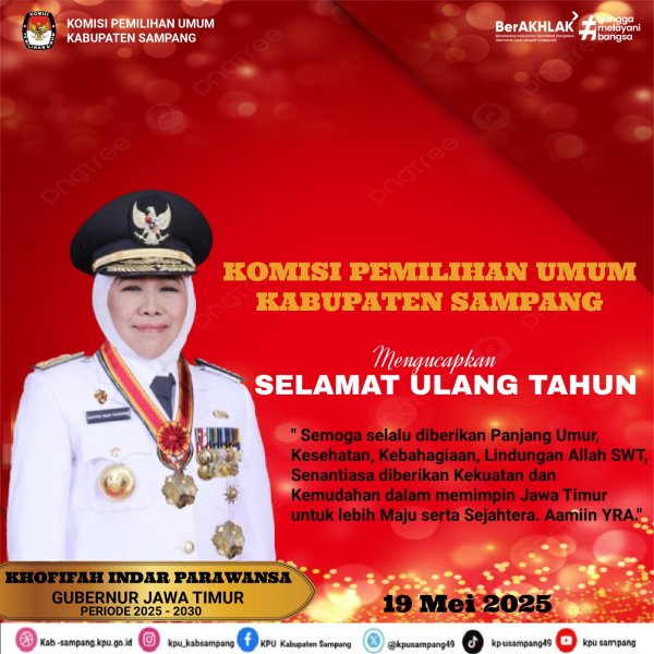 #TemanPemilih..... hari ini Senin 19 Mei 2025, segenap keluarga besar KPU Kabupaten Sampang mengucapkan selamat ulang tahun kepada Gubernur Jawa Timur KHOFIFAH INDAR PARAWANSA