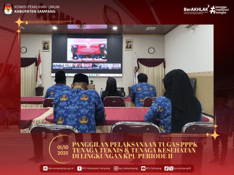 #TemanPemilih.... Hari ini Rabu, 01 Oktober 2025, KPU Kabupaten Sampang mengikuti kegiatan "Panggilan Melaksanakan Tugas Pegawai Pemerintah dengan Perjanjian Kerja (PPPK) Tenaga Teknis dan Tenaga Kesehatan di Lingkungan Sekretariat Jenderal KPU Tahun Anggaran 2024 Periode II" yang diselenggarakan oleh KPU Provinsi Jawa Timur secara daring melalui Zoom Meeting di Aula KPU Kabupaten Sampang.