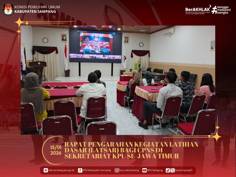 #TemanPemilih.... Hari ini, Kamis, 15 Januari 2026, KPU Kabupaten Sampang mengikuti Rapat Pengarahan Kegiatan Latihan Dasar (Latsar) bagi CPNS Sekretariat KPU se-Jawa Timur, secara daring, di Aula KPU Kabupaten Sampang.