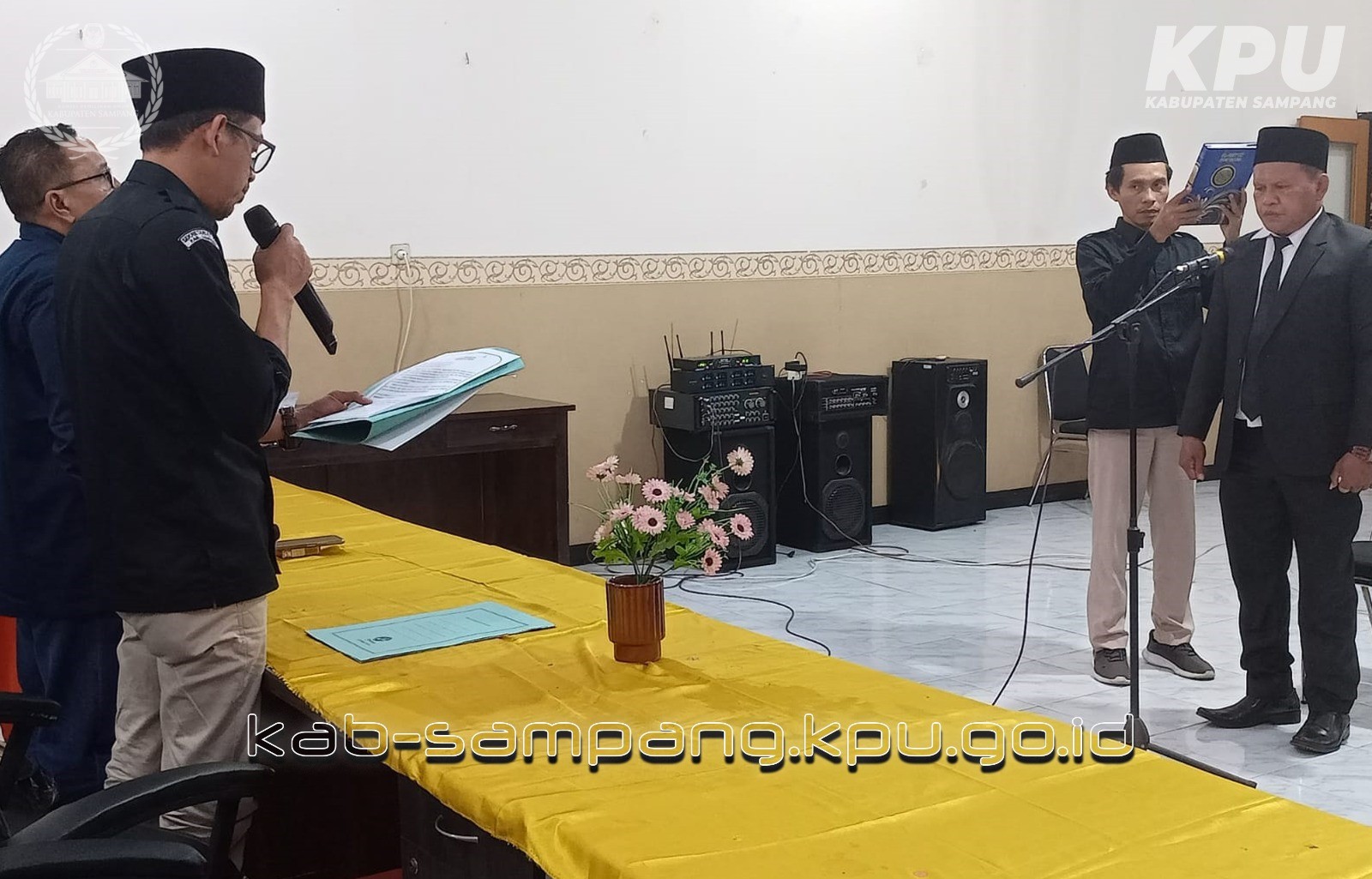 Sampang, kab-sampang.kpu.go.id – Ketua KPU Kabupaten Sampang, Addy Imansyah rersmi megambil sumpah dan melantik 1 (satu) orang Pengganti Antar Waktu (PAW) Anggota Panitia Pemilihan Kecamatan (PPK) Karang Penang di Aula KPU Kabupaten Sampang, Rabu (07/06/23). Addy Imansyah melantik Suganda sebagai Anggota PPK Karang Penang menggantikan Anggota PPK Karang Penang sebelumnya, M. Tomo yang berhalangan tetap (meninggal dunia) pada 17 Mei 2023 kemarin. Dalam sambutannya, Addy Imansyah seusai prosesi pelantikan, mengucapkan selamat kepada Suganda yang merupakan peringkat ke 6 (enam) pada tahapan perekrutan PPK Karang Penang untuk Pemilu Tahun 2024 kemarin “Selamat kepada Saudara Suganda, telah resmi dilantik sebagai Anggota PPK Karang Penang menggantikan Anggota PPK sebelumnya yang meninggal dunia beberapa bulan yang lalu”. Kata Addy. Addy berharap, Suganda dapat segera beradaptasi dengan baik di lingkungan KPU Kabupaten Sampang pada lingkup PPK Karang Penang, “Kami berharap saudara mampu beradaptasi dengan baik di KPU Kabupaten Sampang di PPK Karang Penang, mengingat tahapan sudah berjalan, sehingga tidak menghambat pelaksanaan tahapan” harap Addy. Addy juga berharap, Suganda mampu menjadi Anggota PPK yang professional, Anggota PPK yang berintegritas, Anggota PPK yang memiliki integritas dalam melaksanakan semua tahapan Pemilu di Kabupaten Sampang. Kepada mc, Suganda mengatakan rasa syukurnya usai dilanktik sebagai Anggota PPK Karang Penang menggantikan Anggota PPK Karang Penang sebelumnya yang berhalangan tetap. “Saya berterimakasih telah diberi kepercayaan untuk menjadi Anggota PPK Karag Penang menggatikan Alm. Mas Tomo, semoga Almarhum mendapat tempat terbaik di sisinya. Semoga saya dapat menjalankan tugas menggantikan beliau” ujar Suganda berkaca-kaca. Pria kelahiran Sampit, 26 November 1981 tersebut berkomitmen untuk melaksanakan tugas dengan sepenuh hati, demi mensukseskan penyelenggaraan pemilihan umum serentak tahun 2024. mc