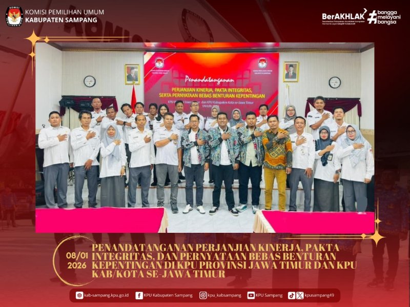 Penandatangan Perjanjian Kinerja, Pakta Integritas, dan Pernyataan Bebas Benturan Kepentingan ini dilakukan secara serentak oleh KPU Provinsi Jawa Timur beserta KPU Kabupaten/Kota se-Jawa Timur. Penandatangan Perjanjian Kinerja, Pakta Integritas, dan Pernyataan Bebas Benturan Kepentingan dilakukan oleh seluruh Ketua dan Anggota KPU Kabupaten Sampang beserta Bapak Sekretaris dan seluruh jajaran kesekretariatan KPU Kabupaten Sampang.