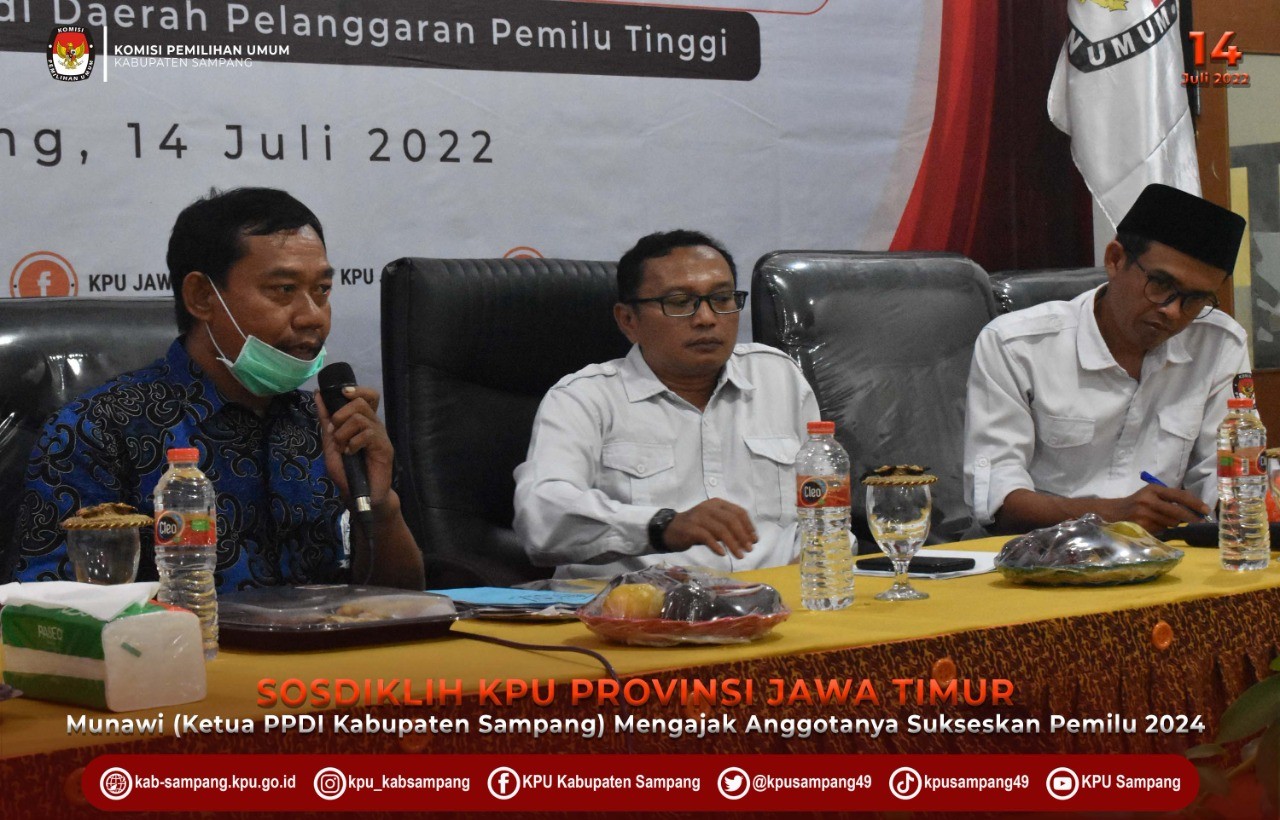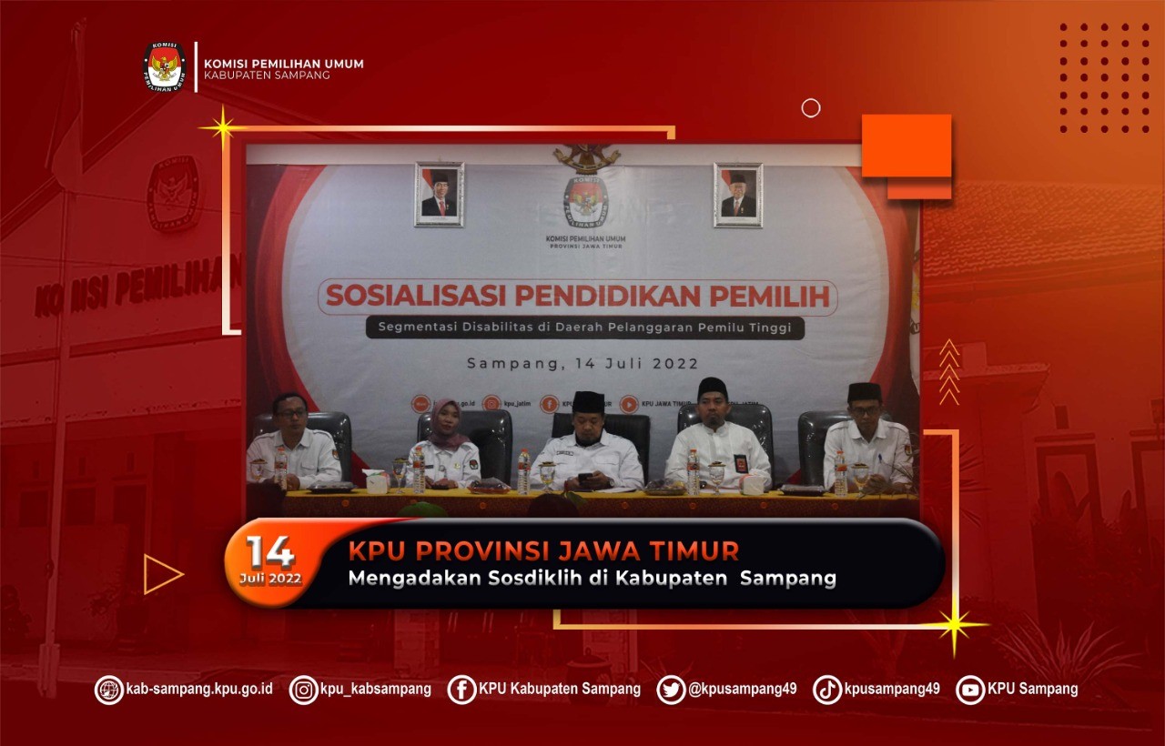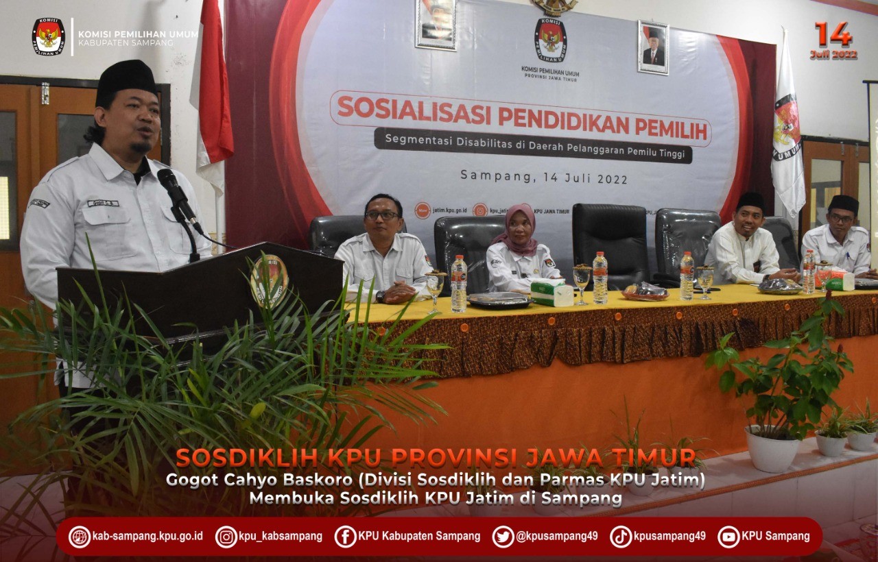 Hai #temanpemilih Sampang, kab-sampang.kpu.go.id – KPU Provinsi Jawa Timur melakukan kegiatan Sosialisasi dan Pendidikan Pemilih di Kabupaten Sampang Kamis (14/07/22). Kegiatan yang mengusung tema Sosialisasi dan Pendidikan Pemilih Segmentasi Disabilitas di Daerah Pelanggaran Pemilu Tinggi tersebut dilaksanakan di Aula KPU Kabuapten Sampang, dan mengundang 30 Anggota PPDI (Perkumpulan Penyandang Disabilitas Indonesia) Kabupaten Sampang, 5 Instansi terkait, dan 5 Aktivis Peduli Disabilitas. Kegiatan tersebut dimaksudkan untuk memberikan sosialisasi dan pendidikan pemilih bagi penyandang diabilitas seperti yang diutarakan oleh Kabag Tekmas KPU Provinsi Jawa Timur Popong Anjarseno saat memberikan laporan kegiatan, “tujuan kegiatan ini adalah untuk memberikan sosialisasi mekanisme atau proses Pendidikan pemilih, khususnya pada segmen pemilih disabilitas di Kabupaten Sampang”. Kegiatan yang dihadiri langsung oleh Divisi Sosdiklih dan Parmas KPU Provinsi Jawa Timur, Gogot Cahyo Baskoro, Divisi Perencanaan, dan Logistik KPU Provinsi Jawa Timur, Miftahur Rozaq, dan Sekretaris KPU Provinsi Jawa Timur, Nanik Karsini tersebut difasilitasi oleh KPU Kabupaten Sampang, setelah Sampang dipilih sebagai salah satu lokasi sasaran sosialisasi dan pendidikan pemilih KPU Provinsi Jawa Timur di daerah tertentu. Sampang dipilih sebagai lokasi sasaran sosialisasi dan pendidikan pemilih KPU Provinsi Jawa Timur di daerah tertentu berdasarkan jumlah disabilitas Kabupaten Sampang yang cukup tinggi. Hal itu menukil paparan yang sampaikan oleh Ketua KPU Kabupaten Sampang, Addy Imansyah pada Rakor perdana Persiapan Sosialisasi dan Pendidikan Pemilih KPU Provinsi Jawa Timur di Daerah Tertentu pada tanggal 21 Juni 2022 kemarin. “Kondisi pemilih disabilitas di Sampang cukup tinggi, dan mempunyai kecenderungan keterlibatan dalam pemilu cukup rendah, karena adanya pandangan bahwa disabilitas dipandang sebelah mata, jadi Sampang siap apabila dijadikan lokasi fasilitasi pendidikan pemilih KPU Provinsi Jawa Timur dengan nominasi pemilih disabilitas” papar Addy pada rakor yang diselenggarakan secara daring pada bulan lalu tersebut. Kegiatan yang dimoderatori oleh Ketua KPU Kabupaten Sampang, Addy Imansyah tersebut menghadirkan Ketua PPDI Kabupaten Sampang, Munawi sebagai narasumber dengan membawa materi motivasi untuk kelompok disabilitas dalam berpartisipasi pada pemilu serentak tahun 2024. KPU Kabupaten Sampang juga menugaskan Divisi Sosdiklih, Parmas, dan SDM, Taufiq Rizqon sebagai narasumber internal yang membahas mekanisme pelaksanaan tahapan pemilu serentak tahun 2024, utamanya tahapan pemungutan suara yang ramah disabilitas. (mc) #KPUMelayani #PemiluSerentak2024 #Berintegritas24Jam