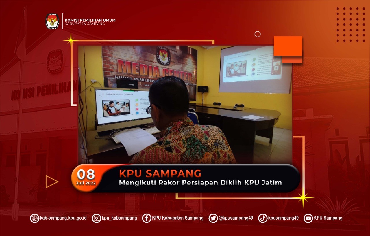 Sampang, kab-sampang.kpu.go.id – Jumat (08/07/22) pagi, KPU Kabupaten Sampang menghadiri rakor kesiapan pendidikan pemilih KPU Provinsi Jawa Timur di daerah tertentu (Kabupaten Sampang, Kabupaten Gresik, dan Kota Probolinggo) secara daring. Dalam kegiatan yang diselenggarakan oleh KPU Provinsi Jawa Timur tersebut, KPU Kabupaten Sampang yang diwakili oleh Ketua, Addy Imansyah, Divisi Sosdiklih, Prmas, dan SDM, Taufiq Rizqon, Plt. Sekretaris, Arif Yudiono, dan Kasubag Tekmas, Mudhar secara terpisah tersebut memaparkan konsep kegiatan pendidikan pemilih KPU Provinsi Jawa Timur di Kabupaten Sampang.
