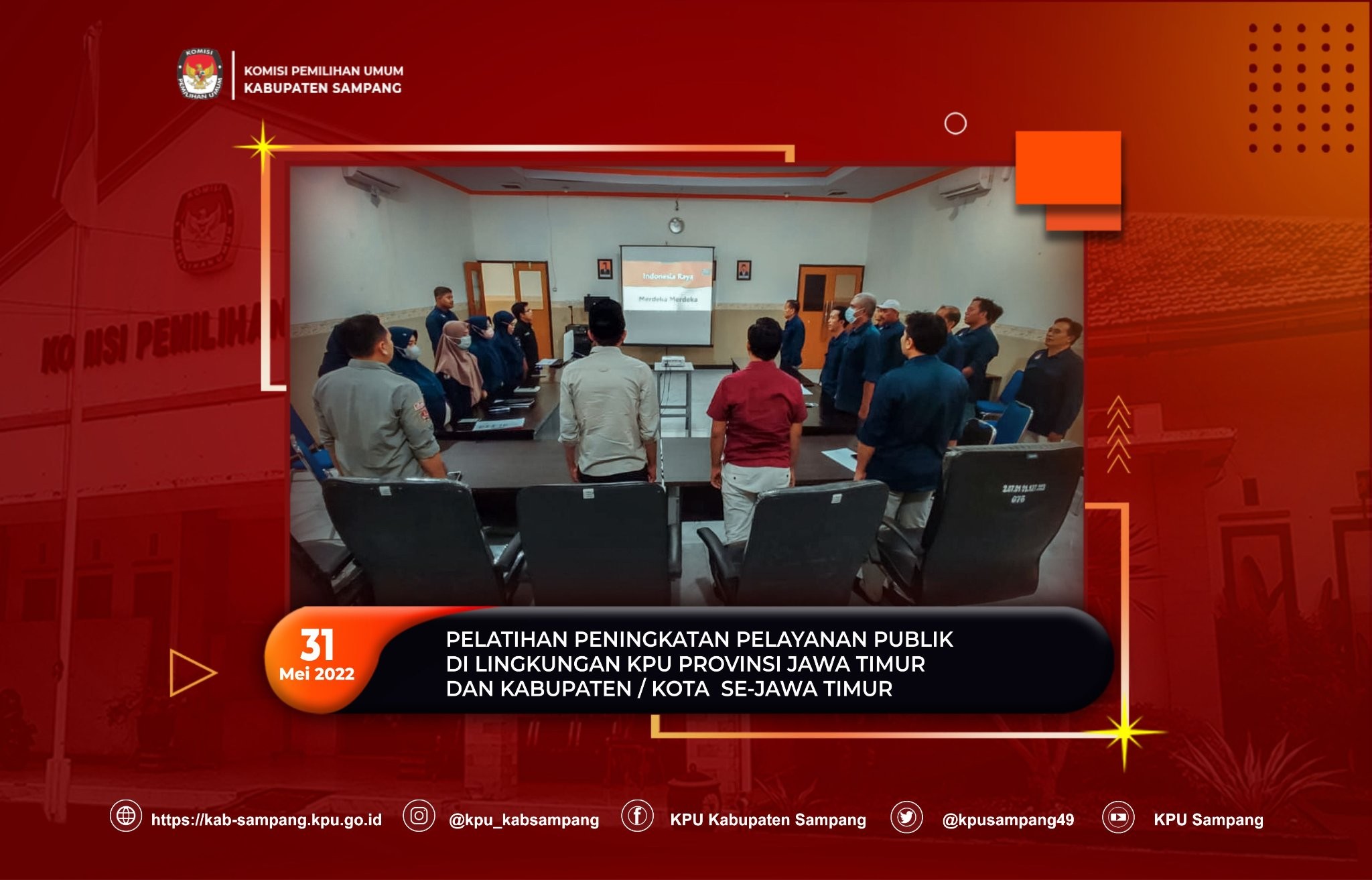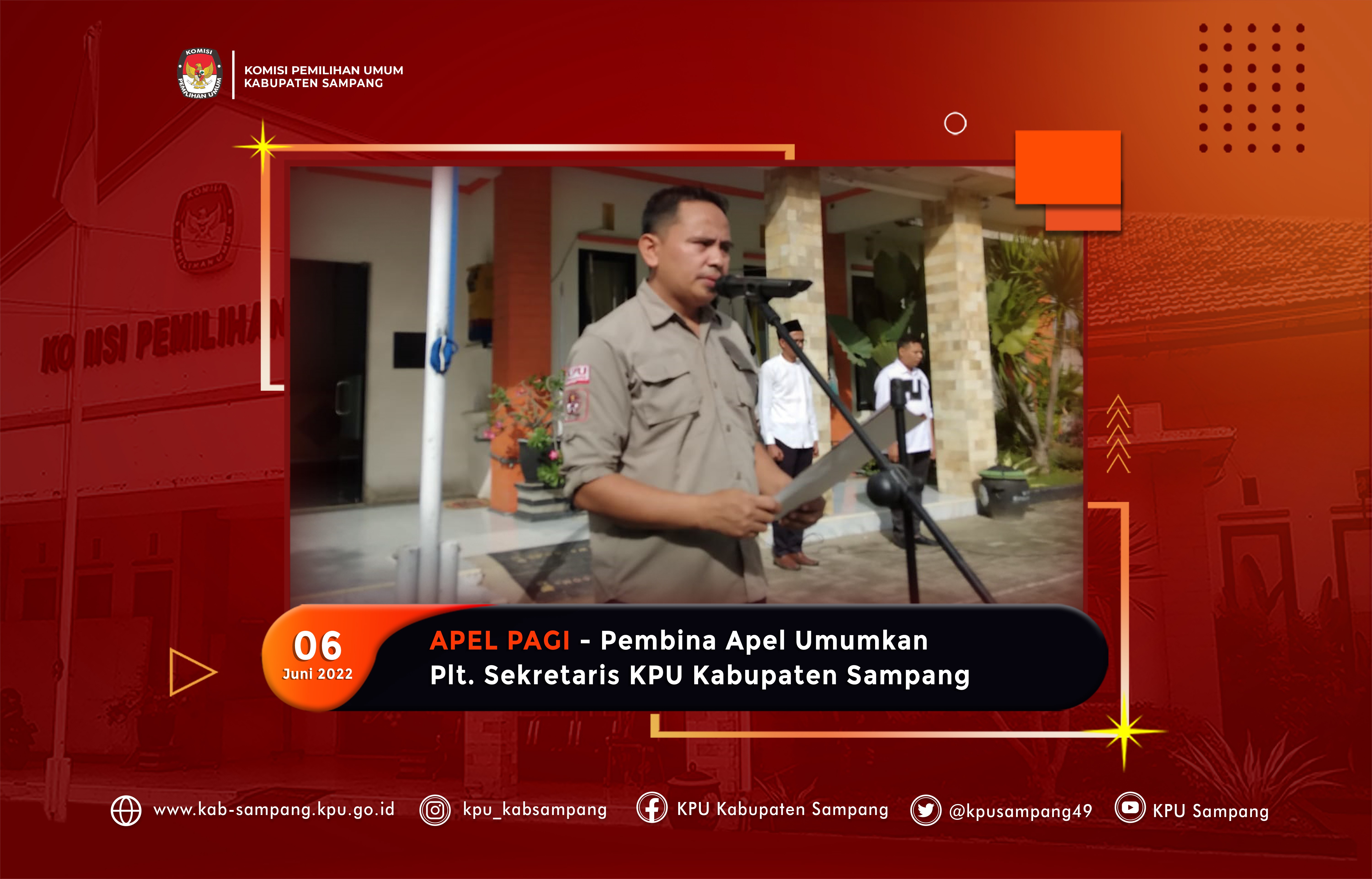 Hai #temanpemilih Sampang, kab-sampang.kpu.go.id – KPU Kabupaten Sampang menggelar Apel Pagi (06/06/22) di Halaman Kantor. Hal ini berdarsarkan Surat Edaran Ketua KPU RI Nomor : 604/SDM.03.5-SD/05/KPU/VI/2021 tentang Himbauan Pelaksanaan Apel Pagi. Dalam Apel Pagi yang dikuti oleh Komisioner, Plt. Sekretaris, Kasubag, dan Staf KPU Kabupaten Sampang tersebut, M. Syamsul Arifin mengumumkan Plt. Sekretaris KPU Kabupaten Sampang, yakni H. Arif Yudiono, yang merupakan Kasubag Program, Data, dan Informasi KPU Kabupaten Sampang. “Hari ini, kita sudah punya Plt. Sekretaris berdasarkan Surat Perintah Setjen KPU RI Nomor 200/SDM.055-Spt/04/2022 yang diteruskan oleh Surat Sekretaris KPU Provinsi Jawa Timur Nomor 1291/SDM.05.05-SD/35/2022. Selamat kepada H Arif Yidiono, Kasubag Program, Data, dan Informasi sebagai Plt. Sekretaris KPU Kabupaten Sampang” kata Divisi Hukum dan Pengawasan KPU Kabupaten Sampang dalam amanahnya. M Syamsul Arifin juga meminta semua Komisioner dan Jajaran Sekretariat untuk mendukung H. Arif Yudiono sebagai Plt. Sekretaris KPU Kabupaten Sampang. H. Arif Yudiono akan menjabat sebagai Plt. Sekretaris KPU Kabupaten Sampang selama 3 (tiga) bulan atau sampai ditetapkannya Sekretaris Devinitif. Sebelumnya, kekosongan Pimpinan Sekretariat di KPU Kabupaten Sampang, diambil alih oleh Kasubag Keuangan, Umum, dan Logistik sebagai Plt. Kuasa Pengguna Anggaran (KPA) ad-interim. Setelah Apel Pagi, semua Komisioner, dan Jajaran Sekretariat KPU Kabupaten Sampang memberikan selamat kepada H Arif Yidiono. (mc) #kpumelayani #pemiluserentak2024