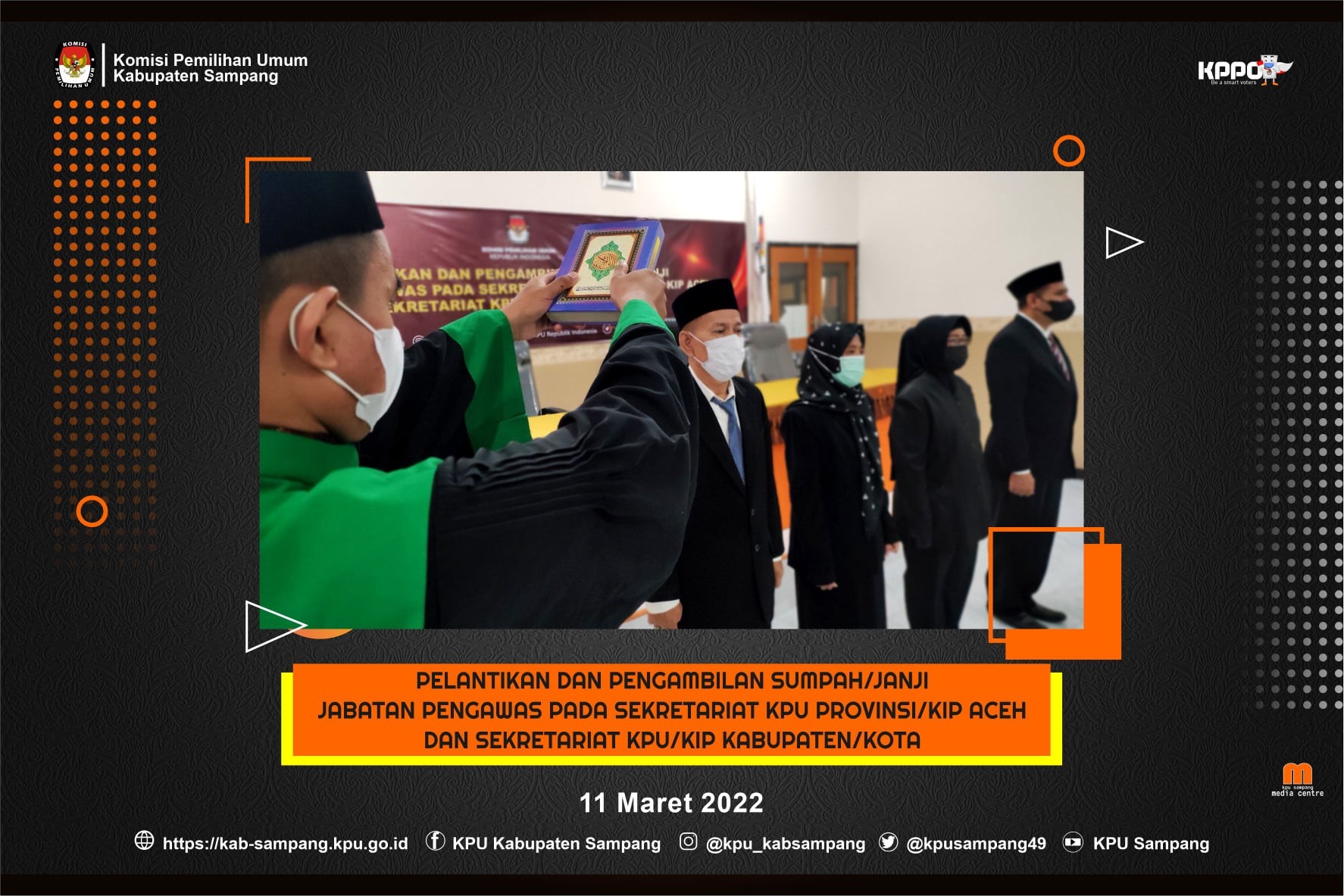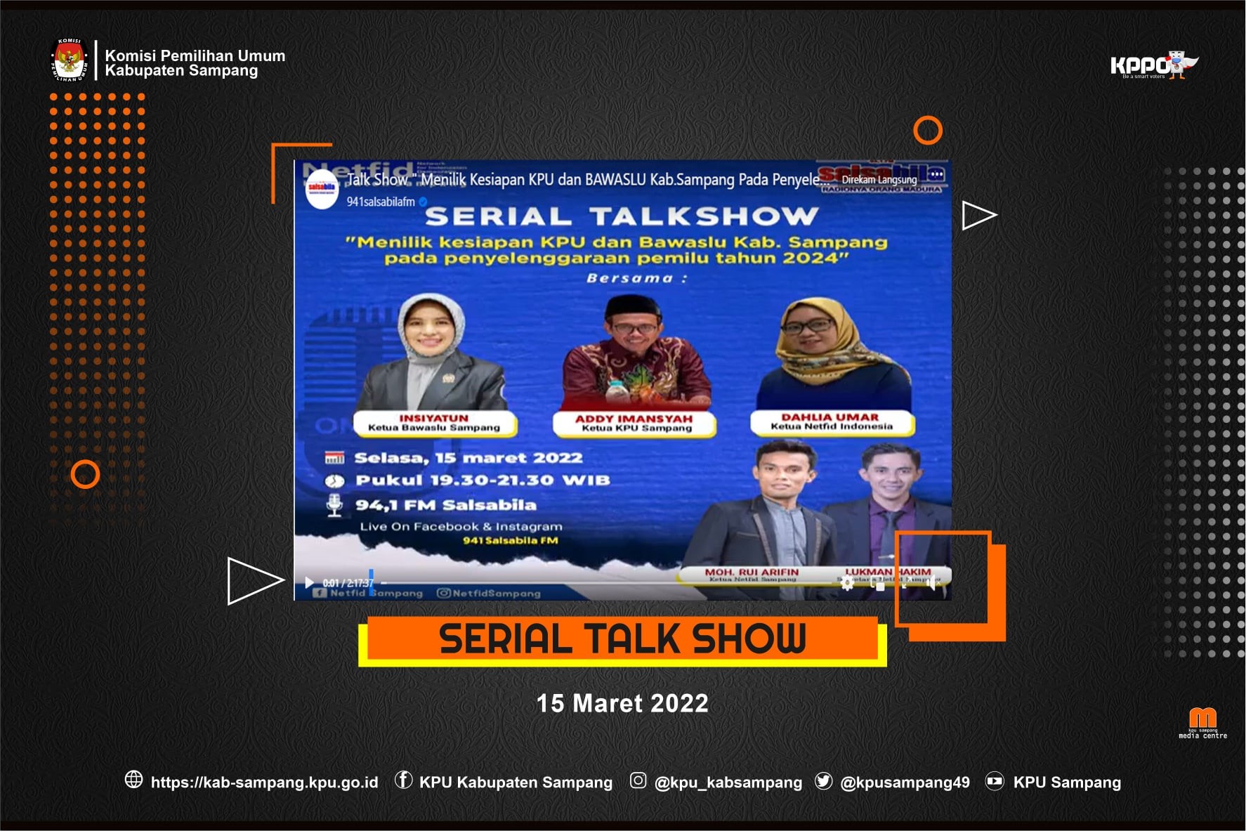 Selasa,15/03/2022, Ketua Komisi Pemilihan Umum Kabupaten Sampang Addy Imansyah menghadiri acara Serial Talk Show yang diadakan oleh Netfid yang di siarkan langsung oleh Radio Salsabila FM dengan tema Menilik Kesiapan KPU dan Bawaslu Kabupaten Sampang pada penyelenggaraan Pemilu Tahun 2024. Tampak hadir juga sebagai Narsum Insiyatun ketua Bawaslu Sampang dan di dampingi juga oleh Ibu Dahlia sebagai Ketua Netfid Indonesia. Disiarkan secara Live pada jam 19.30 s/d 21.30 WIB. Kami hadir untuk meng Informasikan terkait kesiapan kami sebagai penyelenggara pemilu pada tahun 2024 mendatang serta berharap dalam talk Show ini dapat menambah wawasan bagaimana pentingnya arti demokrasi yang sebenarnya bagi Umumnya Masyarakat Indonesia serta Masyarakat Sampang pada khususnya, ujar Addy Imansyah. Selain Banyak hal yang dibahas oleh para Narsum pada Talk Show ini, penyelenggara juga membuka sesi tanya jawab via telepon dan chat live lewat kanal Medsos Salsabila FM. Mulai dari pembukaan sampai akhir dari diskusi pada Talk Show kali ini alhamdulillah berjalan lancar sesuai dengan harapan. #kpumelayani #pemiluserentak2024 • Media centre