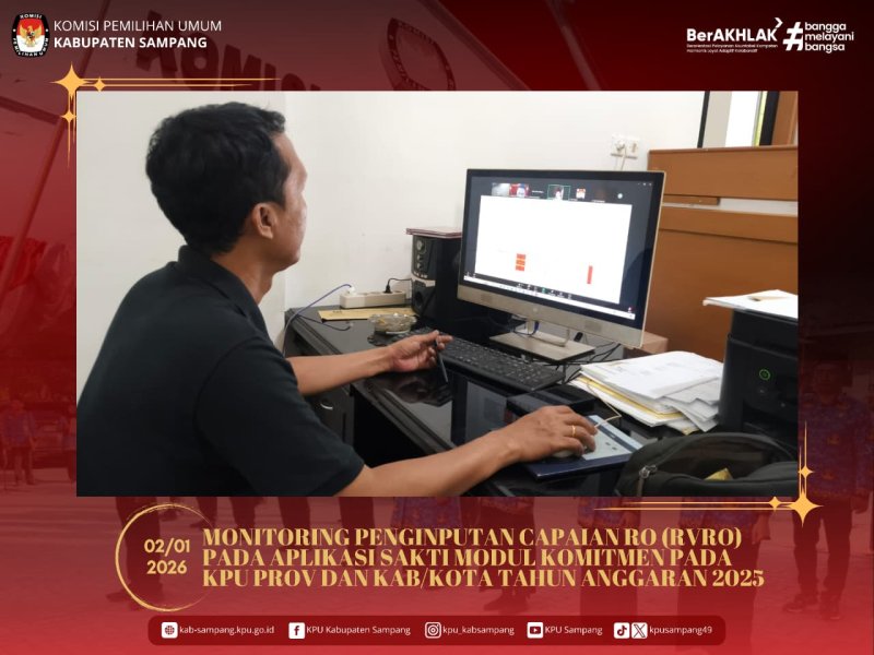 #TemanPemilih.... Hari ini, Jum'at, 02 Januari 2026, KPU Kabupaten Sampang mengikuti Monitoring Penginputan Capaian RO (RVRO) pada Aplikasi Sakti Modul Komitmen pada KPU Provinsi dan KPU kabupaten/Kota Tahun Anggaran 2025 secara daring, melalui Zoom Meeting, di Kantor KPU Kabupaten Sampang.
