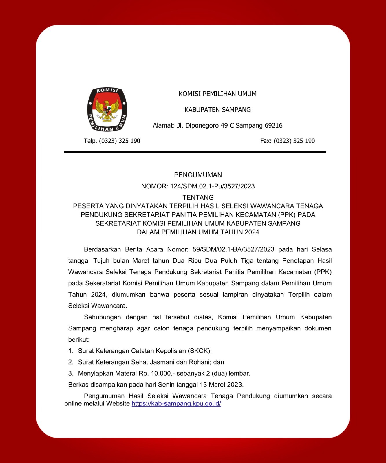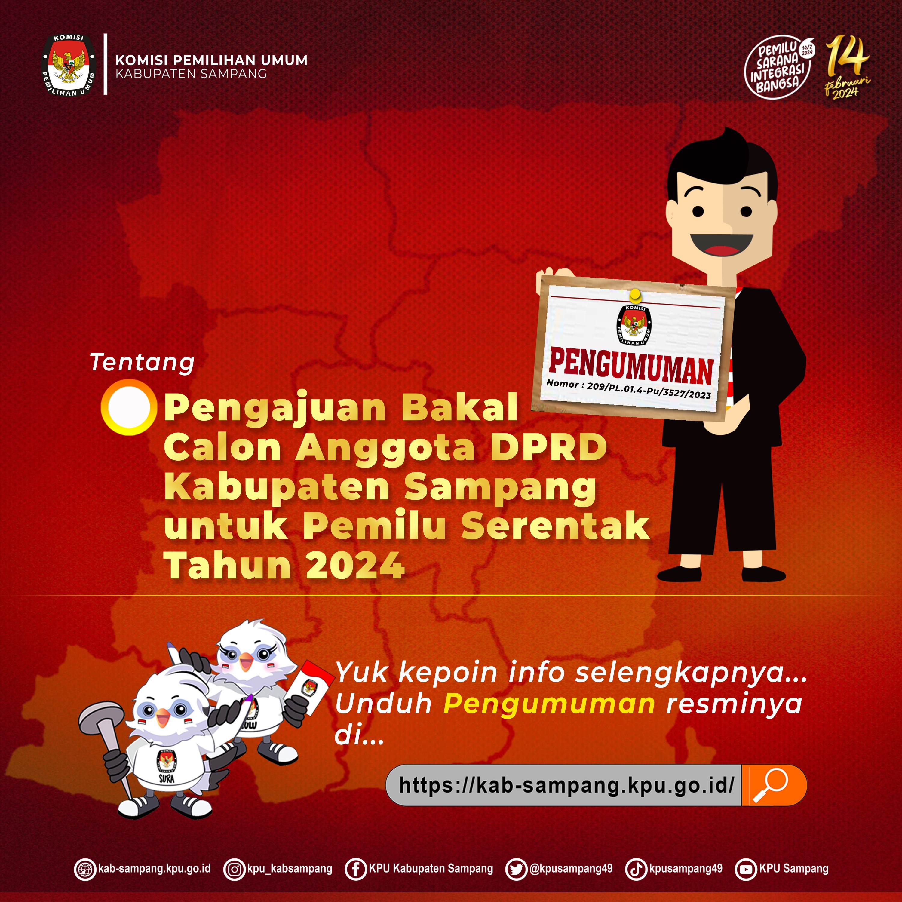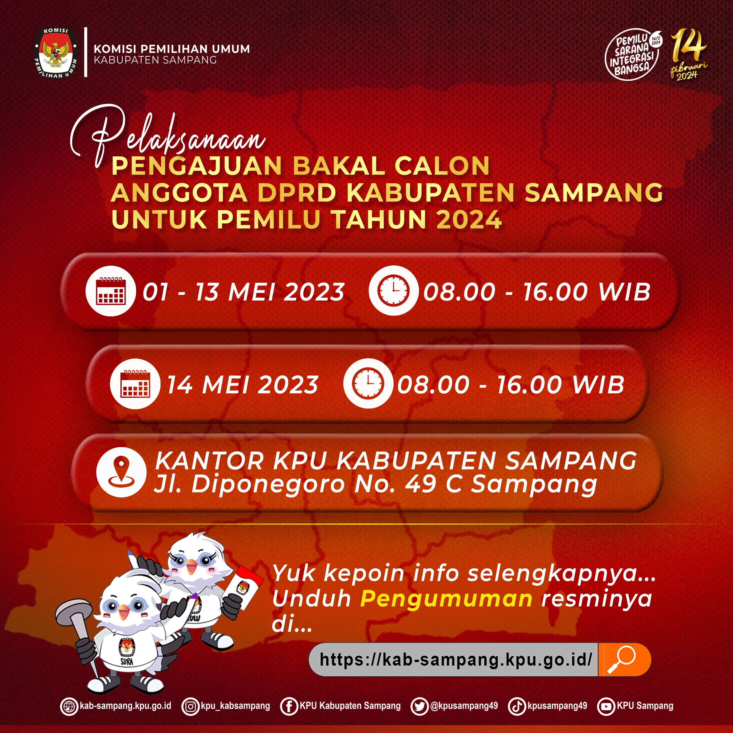 #TemanPemilih, Hari ini, 01Mei 2023 sampai dengan 14 Mei 2023, Komisi Pemilihan Umum Kabupaten Sampang membuka penerimaan pengajuan bakal calon anggota Dewan Perwakilan Rakyat Daerah (DPRD) Kabupaten Sampang untuk Pemilu Serentak Tahun 2024 melalui Partai Politik Peserta Pemilu pada kepengurusan tingkat Kabupaten/Kota, simak ketentuannya dengan mengunduh pengumuman resminya,