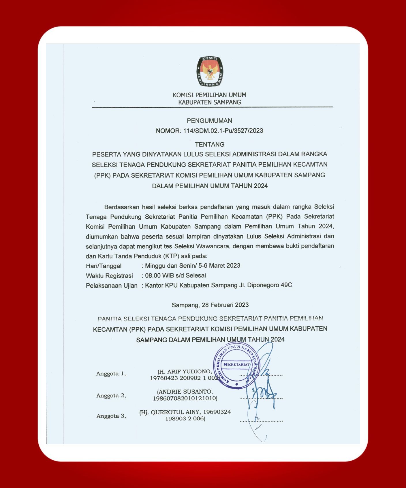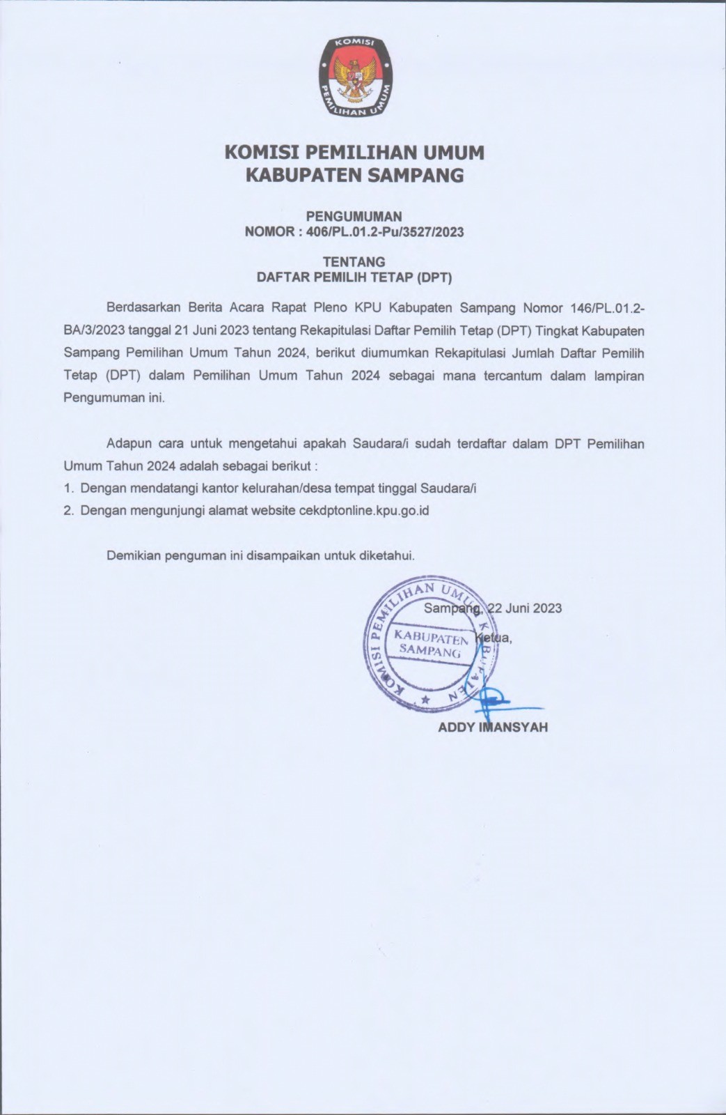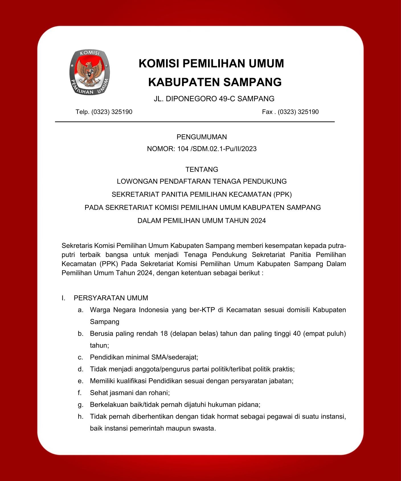 #TemanPemilih, Hari ini, 01Mei 2023 sampai dengan 14 Mei 2023, Komisi Pemilihan Umum Kabupaten Sampang membuka penerimaan pengajuan bakal calon anggota Dewan Perwakilan Rakyat Daerah (DPRD) Kabupaten Sampang untuk Pemilu Serentak Tahun 2024 melalui Partai Politik Peserta Pemilu pada kepengurusan tingkat Kabupaten/Kota, simak ketentuannya dengan mengunduh pengumuman resminya,